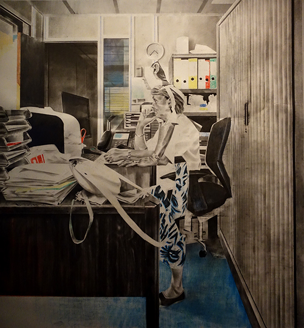 Laurent Proux. Bureau, figure en mouvement (2017). L’artiste a travaillé sur les images mentales associées aux mobilités contemporaines, en participant à un atelier rassemblant des personnes aux modes de vie atypiques. Avec du graphite et des pigments sur papier, il évoque l’inscription du corps dans son espace de travail. La mobilité de l’homme aboutit à l’immobilité dans un bureau et à l’assignation des corps.
