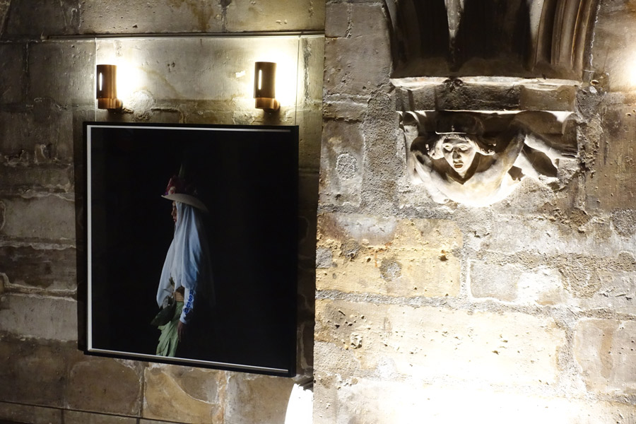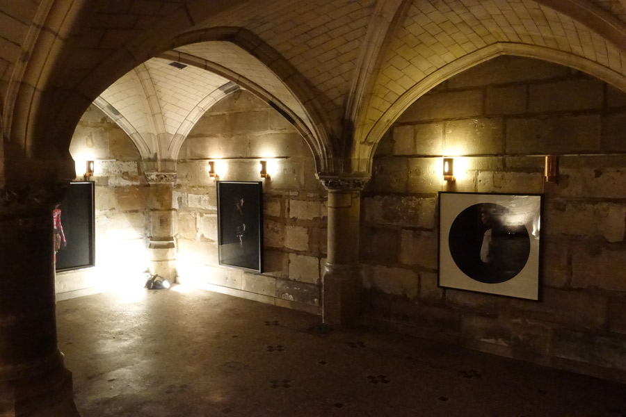 En effet, les photographies choisies par Iwajla Klinke, artiste allemande d’une quarantaine d’années, trouvent dans la crypte sombre de Saint-Merry [1] un milieu totalement différent de celui des galeries qui accroît la part de mystère et de rituel habituelle dans son œuvre.