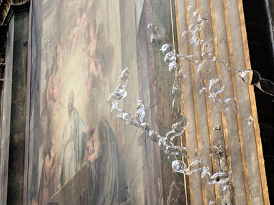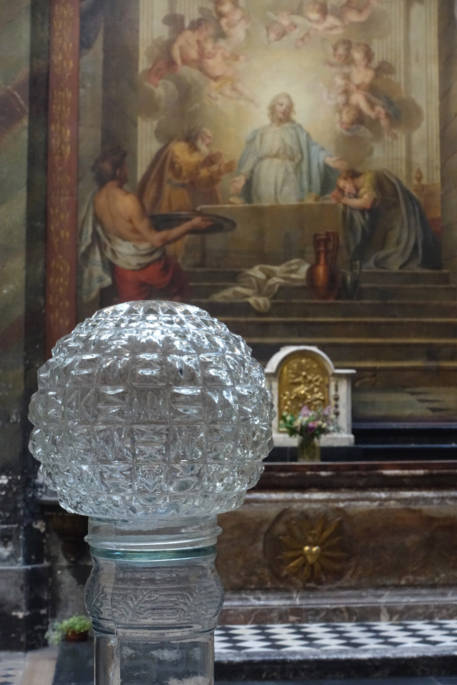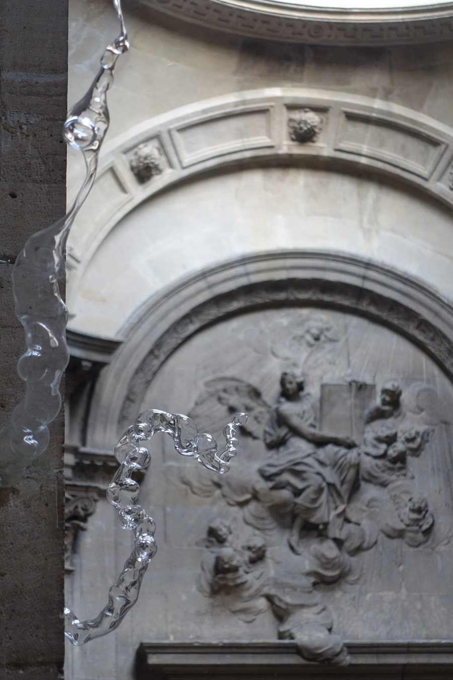 « Souffle » est une œuvre où le verre est travaillé et soufflé in situ et dans laquelle Julie Legrand laisse échapper de longues bulles transparentes des murs de la chapelle de Communion. Ce sont les enveloppes du propre souffle de l’artiste qui prennent de multiples formes, vivantes et dynamiques. Comme des bulles de savon, poussée par on ne sait quelle vie à l’intérieur des pierres, elles sortent avec gaîté des nombreuses stigmates et anfractuosités des murs et piliers de l’église. L’artiste redouble ainsi les effets baroques de la chapelle de Communion de Boffrand (1743), où volent les anges, à côté de représentations de l’Esprit par des artistes du XVIIIe et du XXIe siècle.