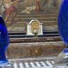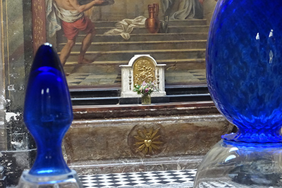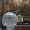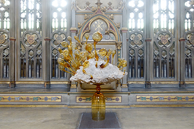 L’assemblage d’un vase, d’une pierre et de verre filé est proche en esprit du précédent. Il témoigne du sens de l’hybridation de l’artiste, qui marie aisément le bois, le fer, le verre, mais aussi de sa capacité à accentuer le sens d’une œuvre lors d’un in situ. Déposé sur un autel néo byzantin du XIXe, le verre de couleur ambre du vase traverse la pierre et monte en bulles ambrées de verre soufflées par l’artiste. À l’image de son souffle.