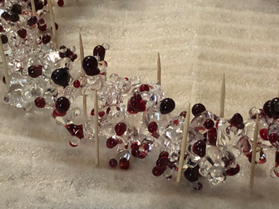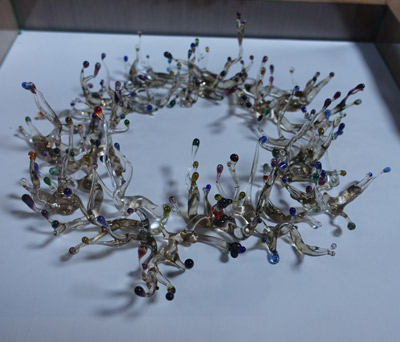 Cet objet d’un seul tenant en verre filé se terminant en gouttes de verre transparentes ou rouges, évoquant naturellement le sang, a été déposé dans un espace sombre, la chapelle de la Vierge aux vitraux comportant des taches rouges.