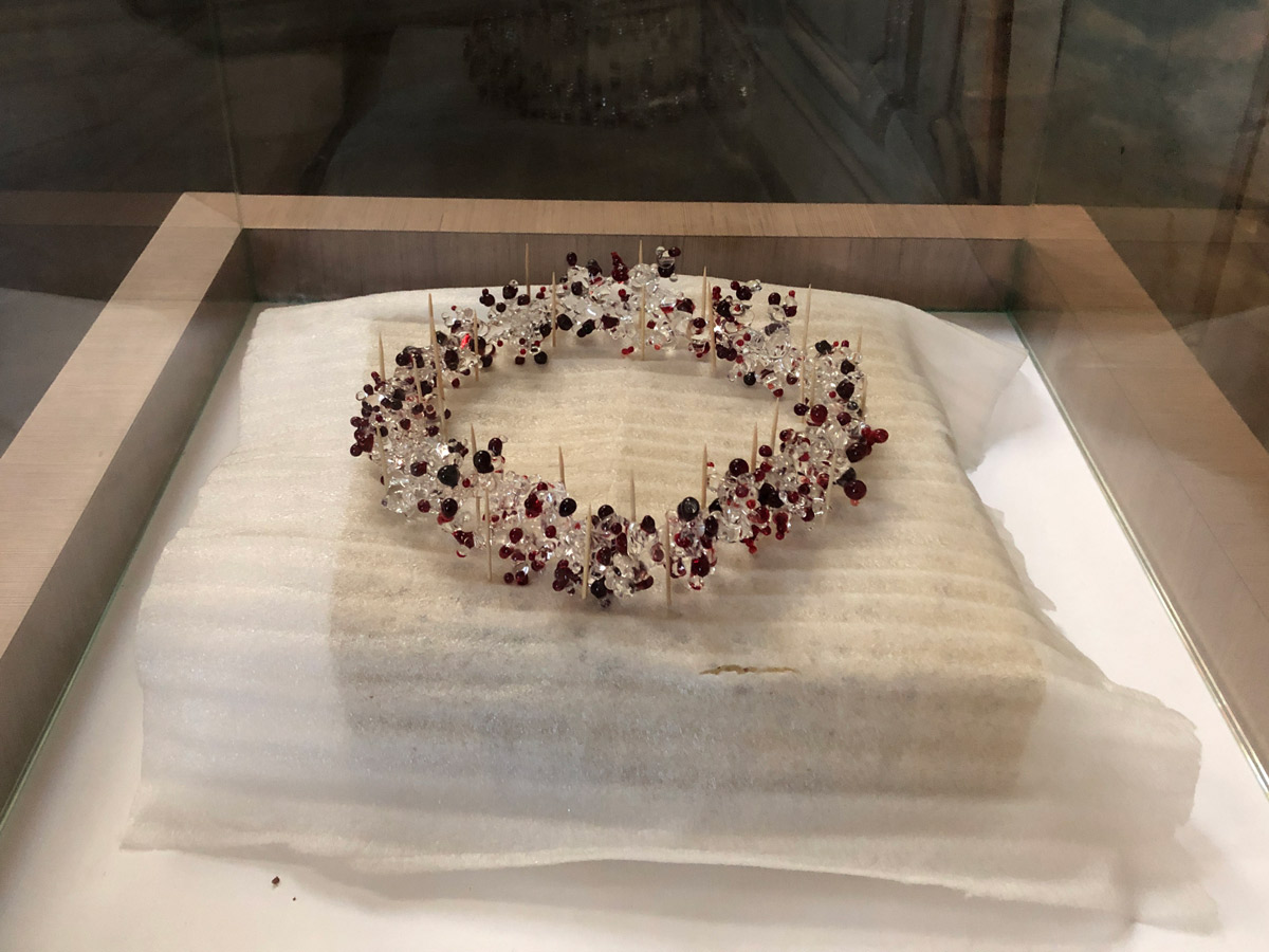 Présentée comme un reliquaire sous sa cloche, Couronne d’épines peut évoquer à certains ce texte : « Sois sans aucune crainte pour ce que tu vas souffrir. […] Sois fidèle jusqu’à la mort, et je te donnerai la couronne de la vie. » Apocalypse 2-10