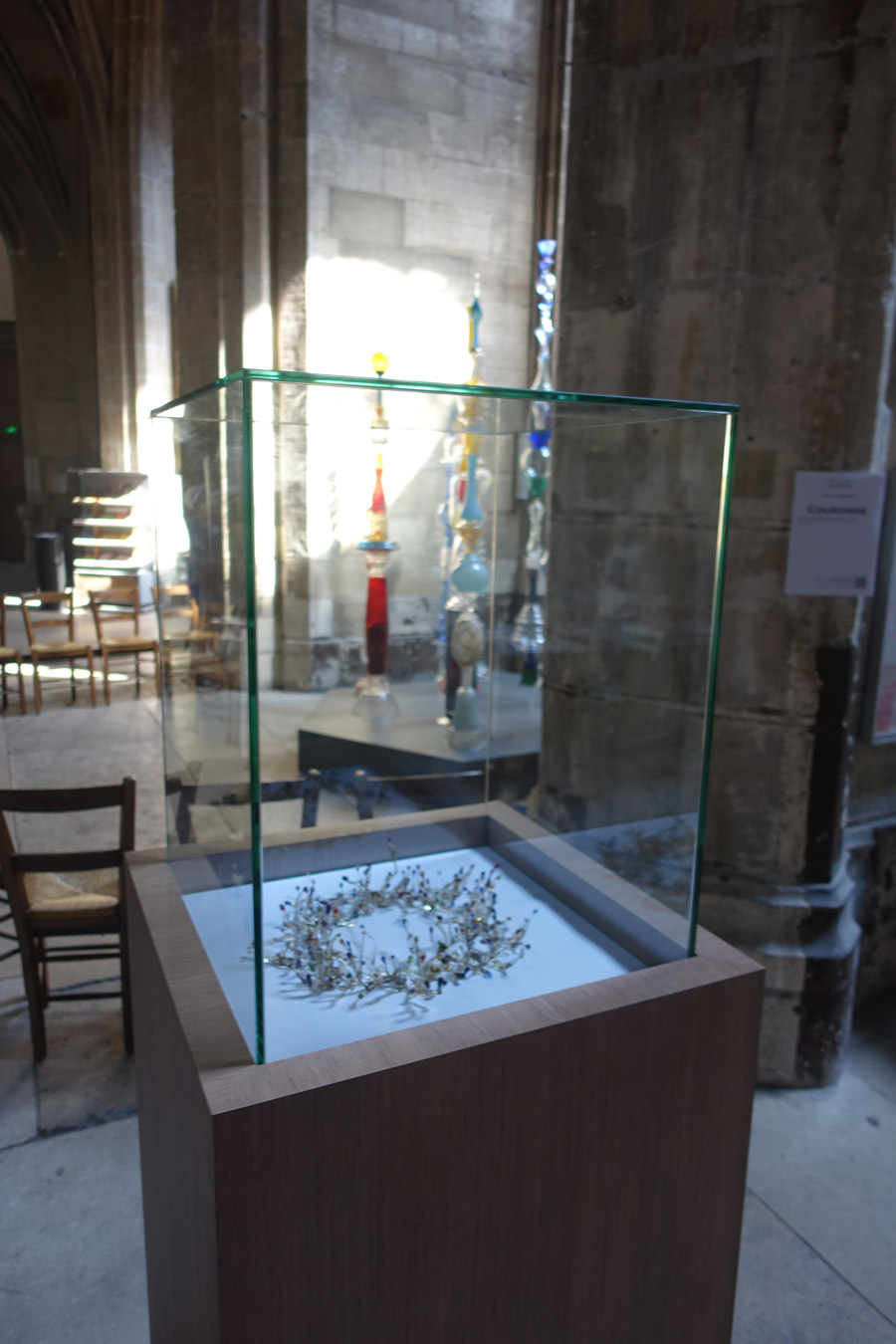 Les deux couronnes qu’elle a conçues pour l’exposition de Saint-Merry sont d’une grande complexité, utilisent des propriétés du verre différentes et jouent avec le in situ.