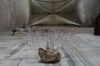 L’arbre de vie est un sujet classique en art, car c’est une représentation du vivant et des quatre éléments. Les Bernardins lui ont consacré une exposition entière (Lire analyse de Voir et Dire >>> ) et l’œuvre poétique de Julie Legrand aurait pu y figurer tant elle exprime l’énergie vitale. Mais ici, il n’y a ni tronc ni racine. Uniquement une hybridation, comme l’artiste aime à les faire entre pierre (sous la terre et les racines) et verre filé se terminant en petites baies rouges, des gouttes de sang comme dans Couronne d’épine. Une délicate plante sauvage, énigmatique et minérale.