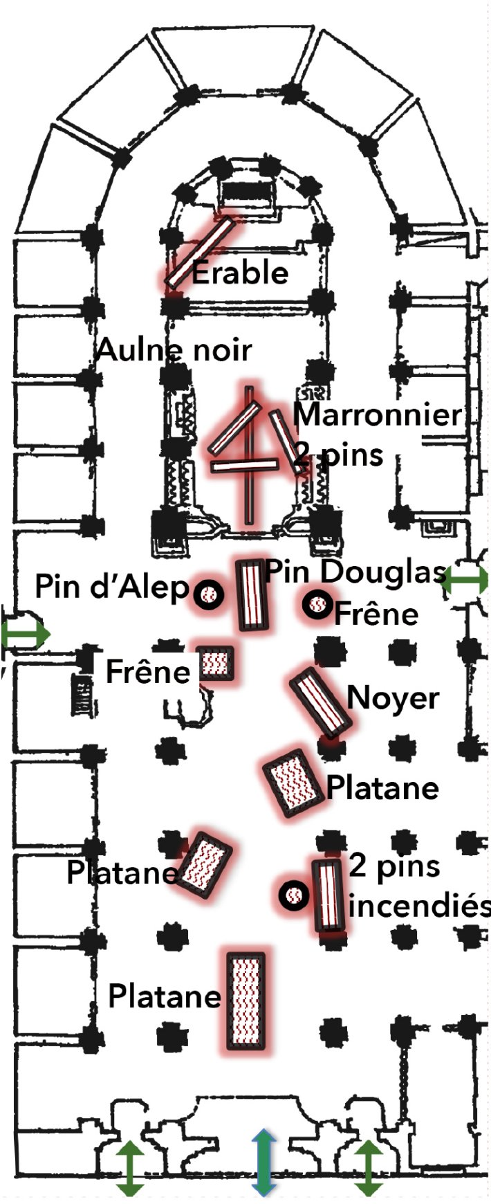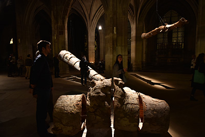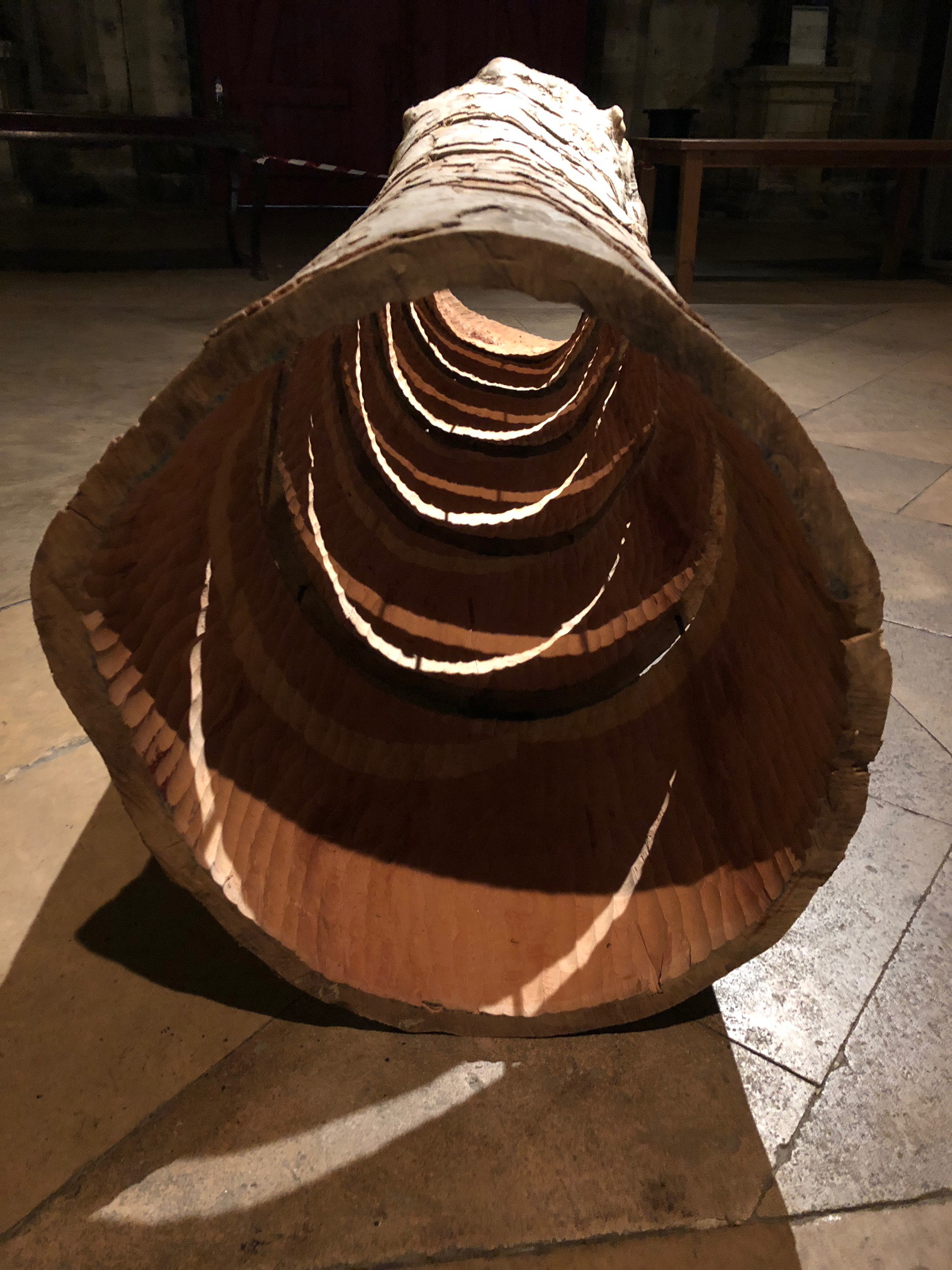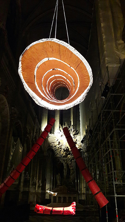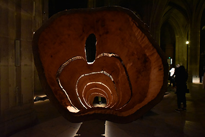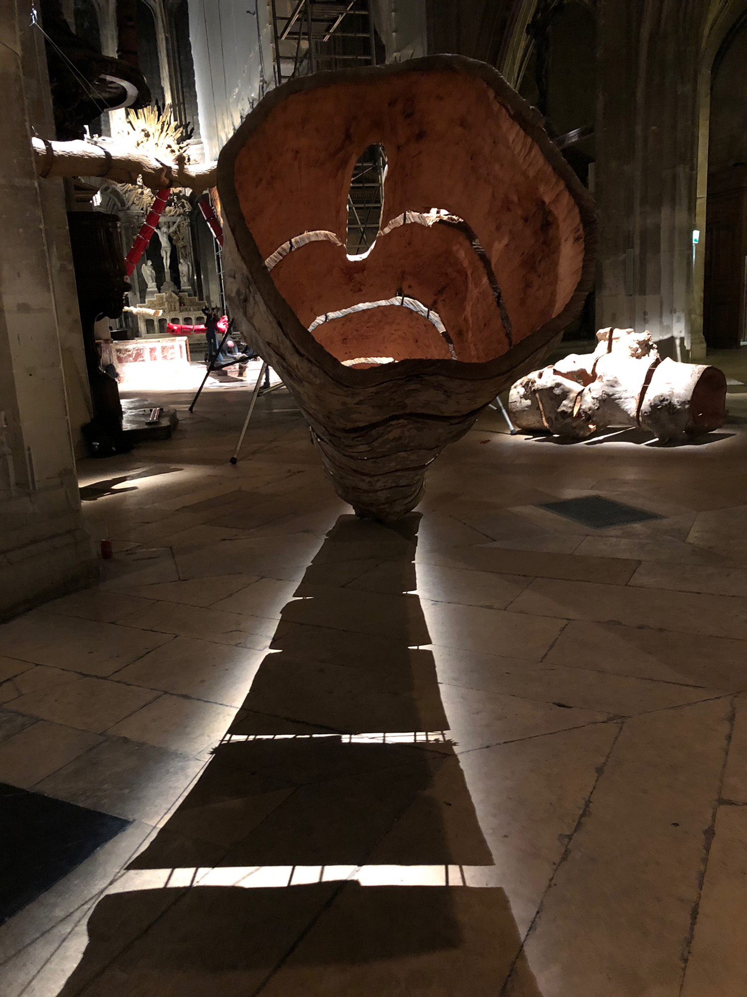 Daniel Van de Velde, sculpteur d’arbres et poète, a placé quinze arbres en procession dans la nef de l’église Saint-Merry. Il s’agit bien d’arbres, non comme on a l’habitude de les voir, mais sans branches ni racines, seulement avec leur fût, dans un minimalisme expressif. Ils ont été abattus par une tempête, et non de main de l’homme, puis segmentés et évidés. Seuls subsistent les derniers cernes de croissance, leur mémoire la plus récente. Ils sont suspendus dans la nef ou posés sur le sol de l’église, une création musicale les célèbre. Des sujets de nature à protéger.