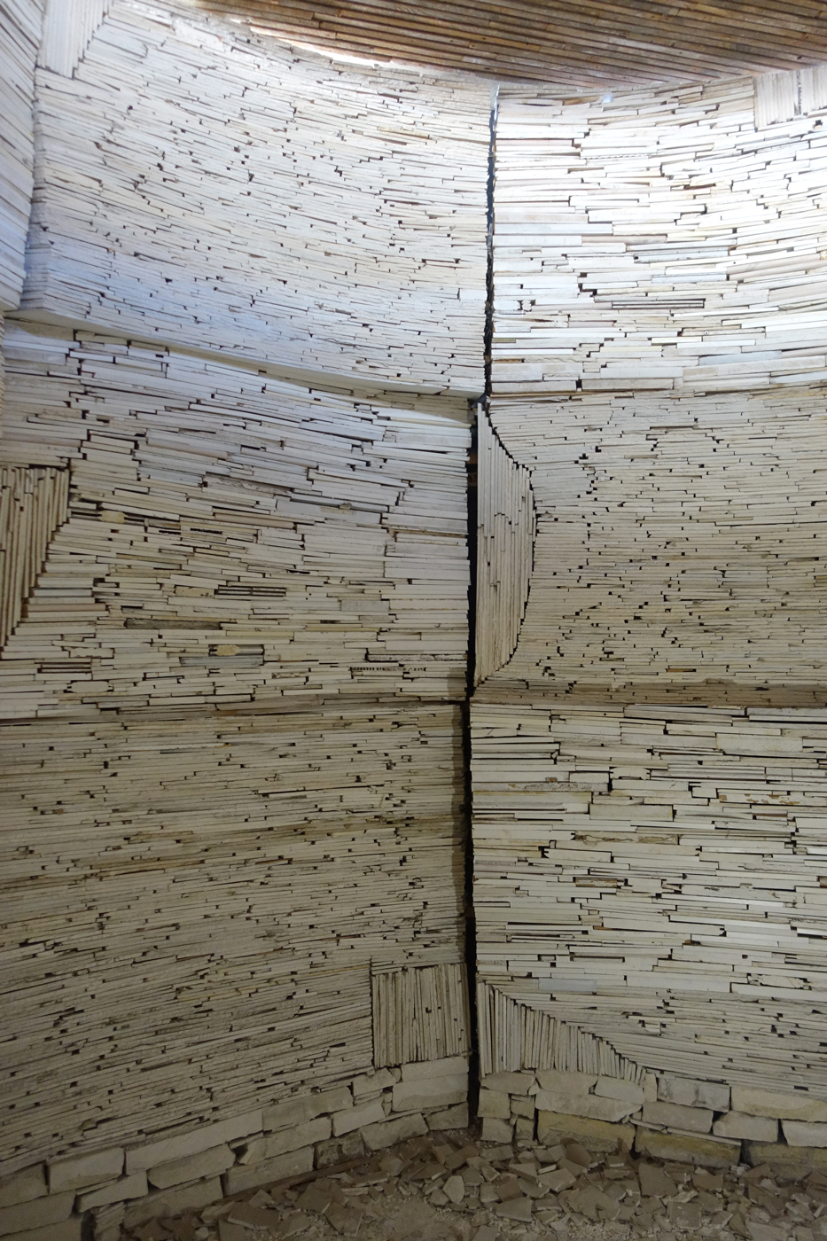 En alignant avec une grande rigueur tous les éléments, en leur assignant un nouvel ordre, en révélant les qualités des textures, comme un peintre hollandais, Marjan Teeuwen est dans la puissance créative et non pas destructive. La notion de nature morte est aussi dépassée puisque le visiteur est témoin d’une création nouvelle. Cette approche esthétique sonde le plus archaïque de l’art : la création des premières images dans les cavernes. En effet, les projets sont inclus dans les lieux qui les ont abrités, les toitures ou planchers sont gardés. Elle est dans la posture des artistes de la préhistoire, par le lieu, et des artistes contemporains qui s’interrogent sur les origines de l’art (cf. l’exposition du Centre Pompidou « La préhistoire, une énigme moderne »), l’installation à Arles rendant palpable ce retour aux origines. Il n’y a cependant aucun geste chamanique, mais en ordonnant ses matériaux, en réalisant une œuvre temporaire, elle construit sa pensée sur la modernité et sa nécessaire mutation.