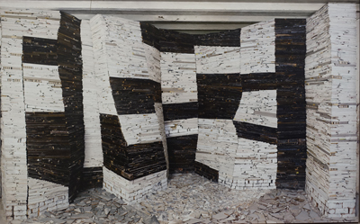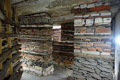 L’artiste, née en 1953 aux Pays-Bas, vivant et travaillant à Amsterdam, a coutume d’investir des bâtiments promus à la démolition. Elle en casse avec intelligence, plus que détruit, tous les éléments, en gardant cependant les toitures, puis les récupère et les trie par nature ou par taille : ciment, Placoplatre, briques, métal, bitume, etc.