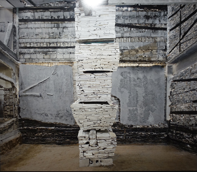 Elle casse des architectures, mais va au-delà des ruines et des natures mortes. Son installation et ses photos monumentales expriment la fragilité et la capacité créatrice.