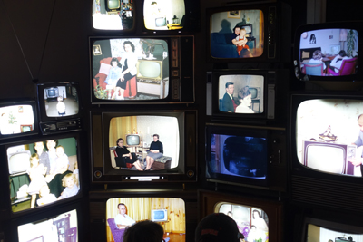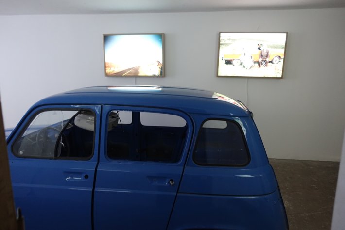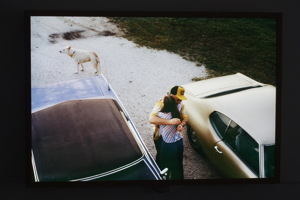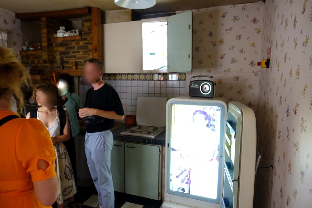 le garage et une simple carrosserie donnent les images de la voiture reine et des relations qu’elle a permises ; l’espace lié à la niche témoigne de la présence de l’animal de compagnie dans la joie familiale ; la chambre truculente exhibe la ronde des photos des endormis ; dans la cuisine, le « royaume » de la femme au foyer idéale, l’image est partout, dans le frigidaire, au-dessus de la table, etc.