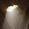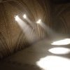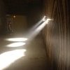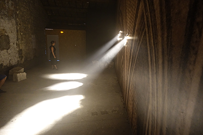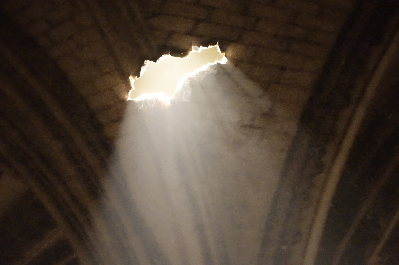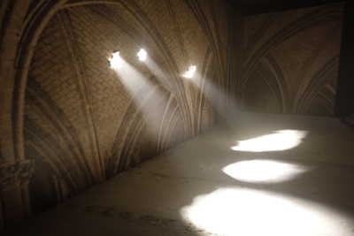 Les ombres et les rayons réels des faisceaux sur le sol éclairent indirectement la toile et amplifient les effets de lumière, et de mystère, de la photo d’origine. Le percement de la toile, celle de l’image de la voûte, renvoie à la fragilité du patrimoine et de celui qui regarde, l’image est le témoin d’un bâtiment historique et transforme l’atmosphère d’un lieu de culte en scène de théâtre mêlant poésie de la ruine et apocalypse. Une expérience immersive finalement sereine que l’on traverse en silence, tant le lieu d’exposition, une pièce très frustre, évoque un lieu sacré.
