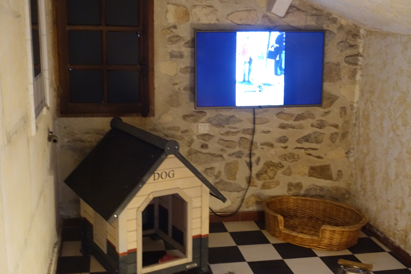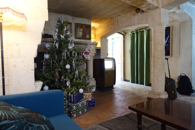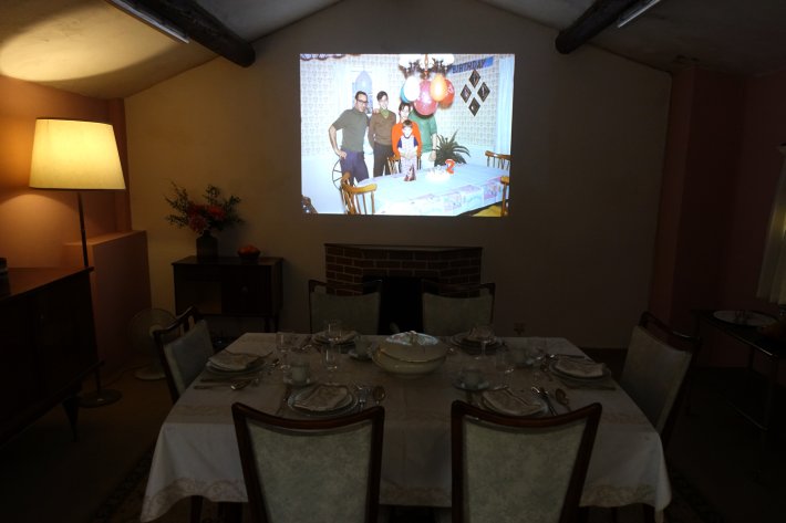 La salle à manger est aménagée pour un repas de Noël et du canapé on peut voir les scènes de repas et de joie, sur un poste de télé des années 60 ou sur un tableau transformé en écran ;