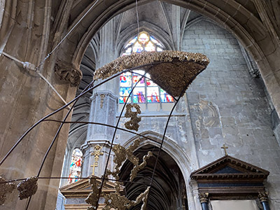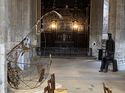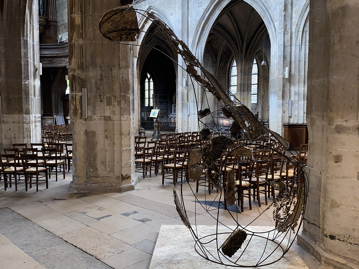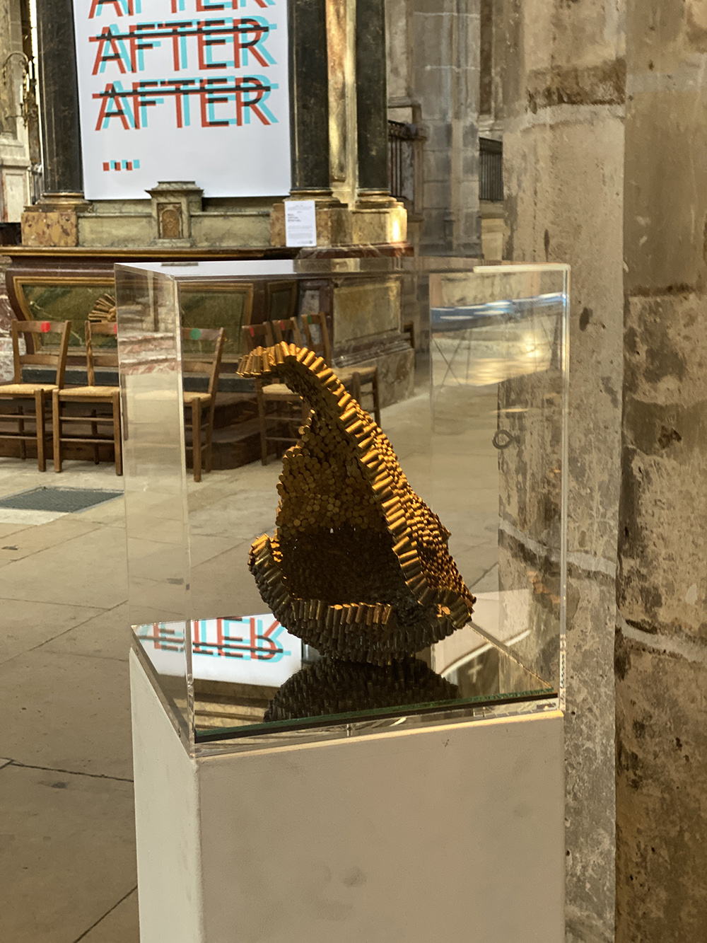 Dans le cadre de l’exposition d’été 2020 à Saint-Merry « Après-After » : une sculpture belle dans son inachèvement qui allie les contraires, une forme dans laquelle on pourrait se réfugier et méditer, une enveloppe alvéolée faite de douilles vides.