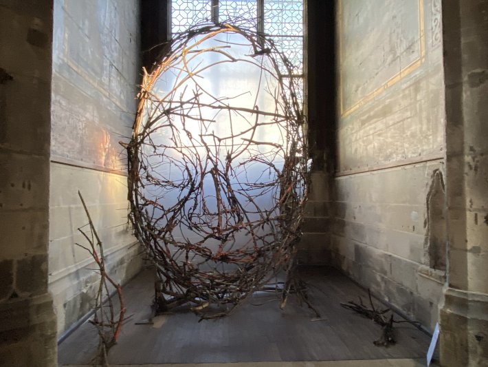 À la place du marbre ou de la pierre, à la place de la matière, il dessine le volume avec ses branchages. Tout est transparent et léger ; il laisse voir le tableau de Coypel et notamment le pied du serviteur de l’auberge, qui monte les marches en direction de la table du Christ et de ses compagnons. Les esthétiques s’entrelacent à plusieurs siècles de distance.
