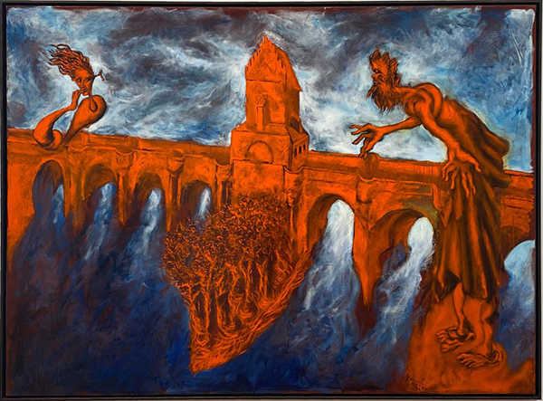 Le tableau est réduit à deux couleurs pour tout exprimer. Rouges sont : le pont ; la femme, avec son buste et son unique bras, mais à l’oreille de profil, décollée, signe de l’écoute ; l’homme en géant, avec des mains à six doigts, des habits de mendiant (?), un Jésus au visage de prophète (?), comme dans le médaillon de la cathédrale de Strasbourg, mais en plus hirsute, tourné vers la femme pour lui parler, peut-être une allusion au rabbin Chouchanide la même génération que Kafka, qui termina sa vie dans l’errance. Le bâtiment, lui, est une allusion claire à la pompe, tout en imagination et non une description, la pompe n’est pas située au bon endroit (elle était placée non pas au milieu du pont, mais devant la deuxième arche) ; les arbres aussi noueux que l’homme.