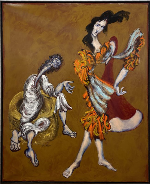 L’entourage de la scène est vide. Garouste se concentre sur l’échange des paroles. Le mouvement des personnages et des vêtements donne forme à cette dynamique.