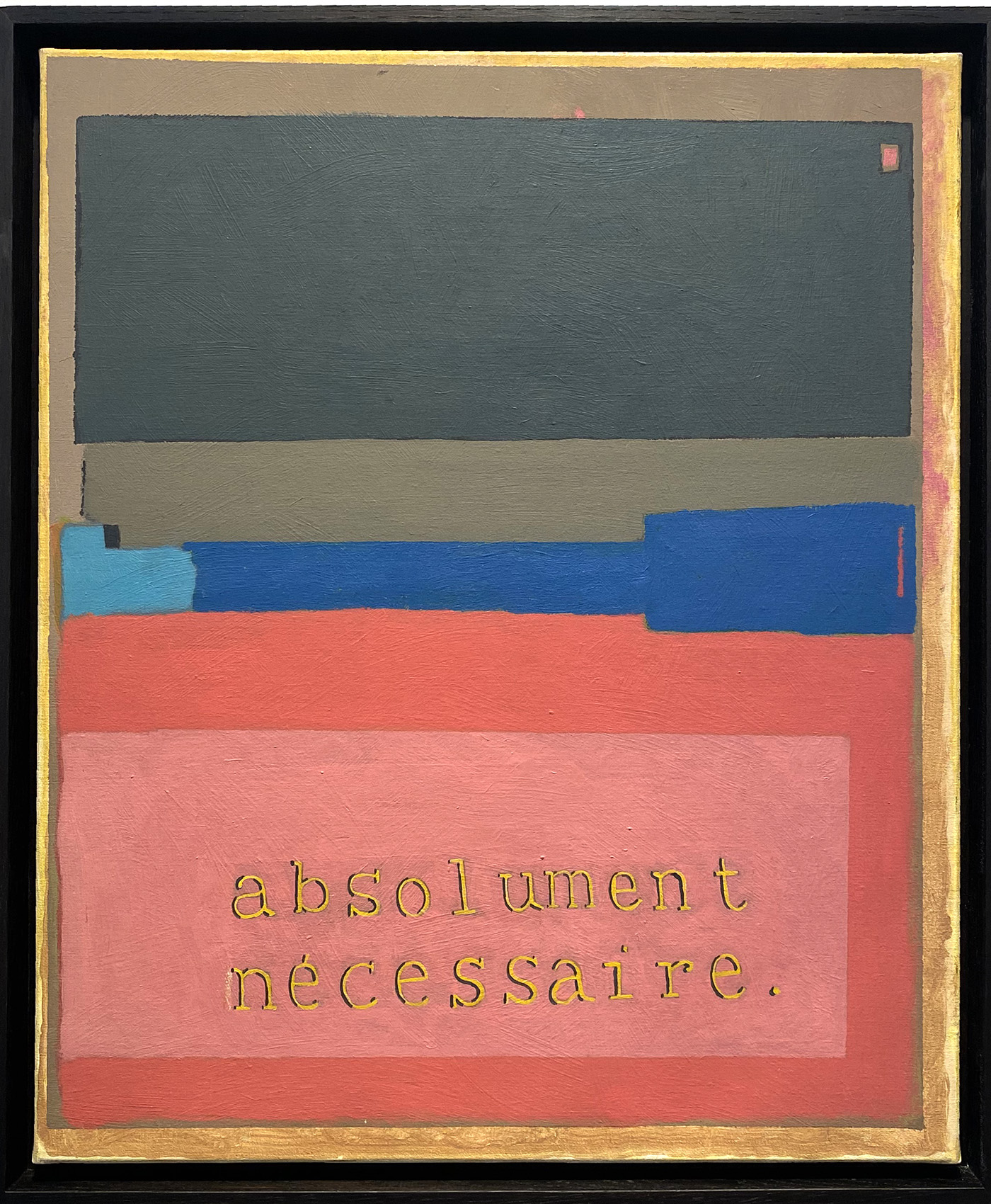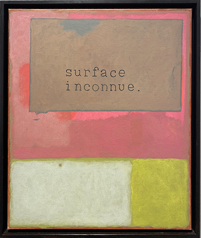 Cette posture est symptomatique dans le tableau « Surface inconnue » où la phrase est peinte dans une sorte de bulle carrée de BD, sur un plan coloré qui vient s’écraser sur d’autres plans, un peu à la manière de Photoshop lorsque l’on fusionne les calques pour obtenir une image unique. Ici la référence aux peintures métaphysiques de Rothko est manifeste, mais Jean-Michel Alberola suggère aussi une interrogation personnelle sur l’art de peindre. Sa réponse se trouve peut-être dans une toile de facture proche "Absolument nécessaire. Voir Portfolio"
