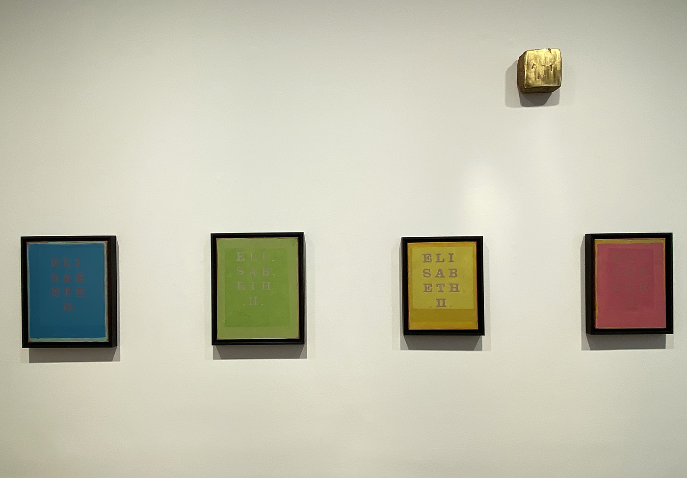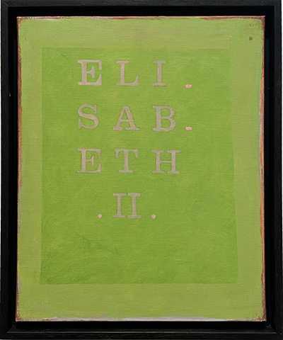 De subtils monochromes « aux couleurs » de la Reine Élisabeth II leur répondent. Car elle non plus n’a pas grand pouvoir en dépit du titre, mais sa liberté intérieure se traduit par le choix de ses tenues, et des chapeaux, « typically english » ! C’est par une calligraphie très rigoureuse de son nom qu’il semble lui rendre honneur, non sans humour.
