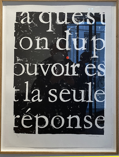 Il est symptomatique que la première œuvre aperçue par le visiteur soit une simple lithographie : « La question du pouvoir est la seule réponse », interpellation que l’artiste avait lancée dans une précédente exposition sous forme de fresque murale. (Lire article V&D. "L’aventure des détails" >>>). Cette question du pouvoir était également centrale dans « Personnes » la grande exposition de Christian Boltanski, aujourd’hui disparu, à Monumenta en 2010 (voir article de V&D>>>), mais elle est ici exprimée moins tragiquement et plus sobrement. Comme thème de sa fresque murale, habituelle dans toutes ses expositions, Jean-Michel Alberola a choisi une autre phrase « Le seul état de mes idées », qui met en abîme les tableaux schématisés de l’exposition à Templon, une sorte d’autoportrait fonctionnant comme une vanité, dans l’esprit de ses rois.