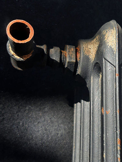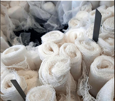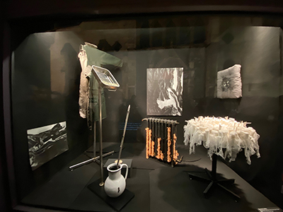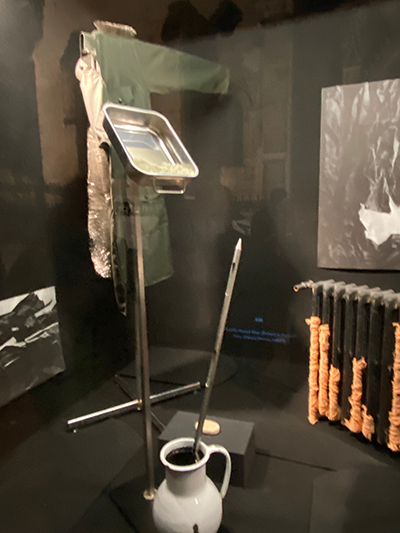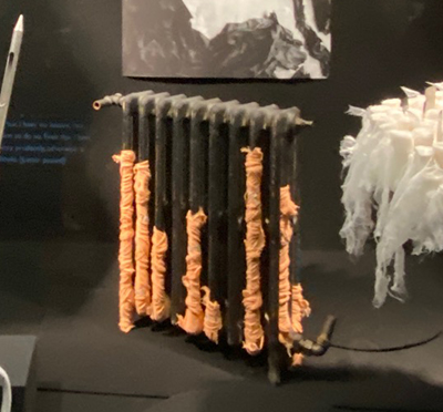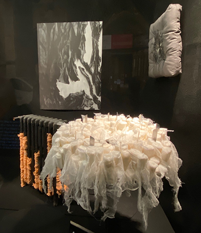 Le radiateur, trouvé par l’artiste, empaqueté avec des bandages, évoque les températures glaciales qui saisissent les corps. Vêtus de simples uniformes de fin coton, les recrues sont saisies par la froideur du climat. Les aiguilles plantées dans la manche de l’uniforme, la couronne funéraire, les objets extraits du monde médical rappellent les blessures endurées, la cruauté, l’indifférence. Les bandes de gaze recouvrent ici des objets comme pour les invisibiliser. Elles matérialisent les soins médicaux apportés aux hommes blessés, mais aussi leurs détresses psychologiques. La Galerie devient lieu de mémoire, qui rend hommage au courage, et dénonce l’absurdité des guerres. »