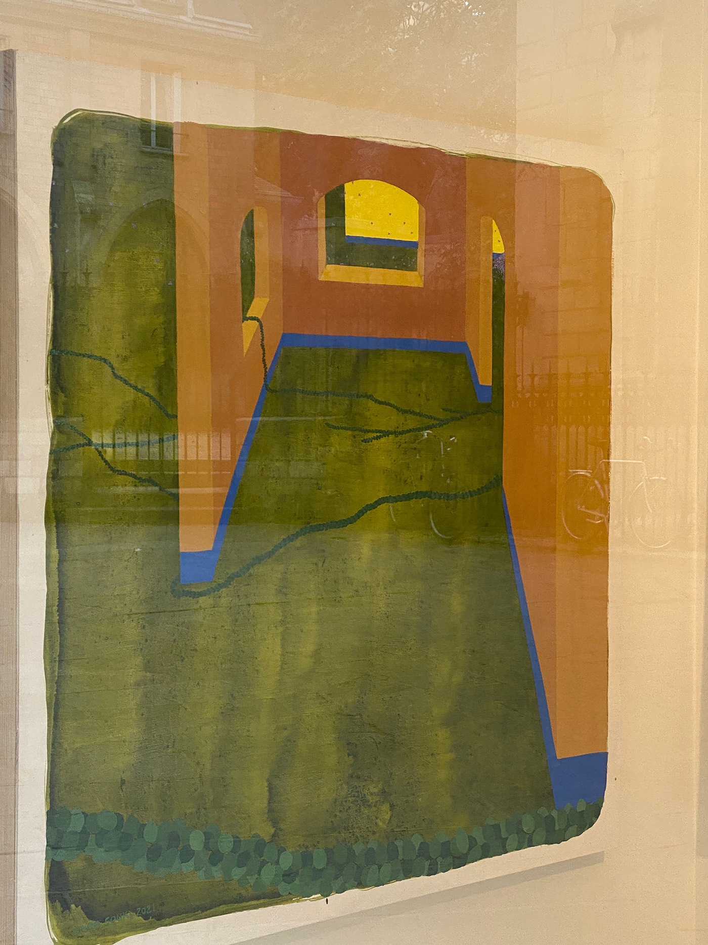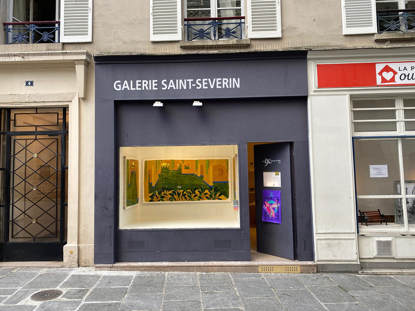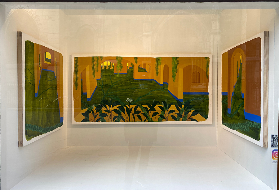 Le triptyque « Intérieurs infinis » que l’artiste a réalisé spécialement pour la vitrine de la Galerie Saint-Séverin fait partie d’un ensemble de peintures récentes autour du thème des liens architecturaux dedans-dehors. Elle crée des espaces et imagine les relations qui s’y développent au-delà des limites culturelles ou géographiques. Bien qu’elle se réfère à des lieux intimes, inscrits dans des souvenirs personnels, elle réveille la mémoire de ceux de notre enfance.