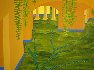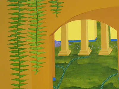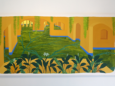 On est en Amérique du Sud, là où la végétation est luxuriante et envahit l’intérieur des maisons. On y passe de l’intérieur à l’extérieur sans grande transition. De cela, le vert, et de la lumière brillante, et des multiples nuances de jaune, l’artiste témoigne. Si un escargot, animal symbolique, se trouve sur le bord de L’Annonciation (1470) de Francesco del Cossa et a été interprété par Daniel Arasse comme une réflexion sur l’illusion de la perspective, c’est un rideau de fleurs bien réelles qui crée l’effet de scène de théâtre. L’infini part de l’intérieur de la maison, c’est la plinthe bleue, toujours de même teinte, qui s’échappe. L’artiste est traversé par l’infini.