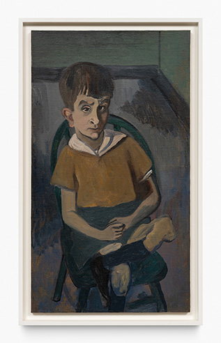 L’autre est une proie sur laquelle le regard d’Alice Neel plonge. Le plancher donne le vertige et le chromatisme des gris et des verts sombres pèsent lourd sur le sentiment de solitude et d’enfermement. Aux jambes trop maigres, trop osseuses, répond la tête, agrandie qui affronte la peintre. Aucun sourire, les lèvres demeurent soudées, mais les sourcils sont en point d’interrogation et les yeux mettent le feu dans la morbidité ambiante. En un mot, le portrait de Ralphie, un condisciple des enfants d’Alice Neel, est un vrai portrait qui du coup est aussi, comme l’écrivait André Breton, « un oracle qu’on interroge ».
