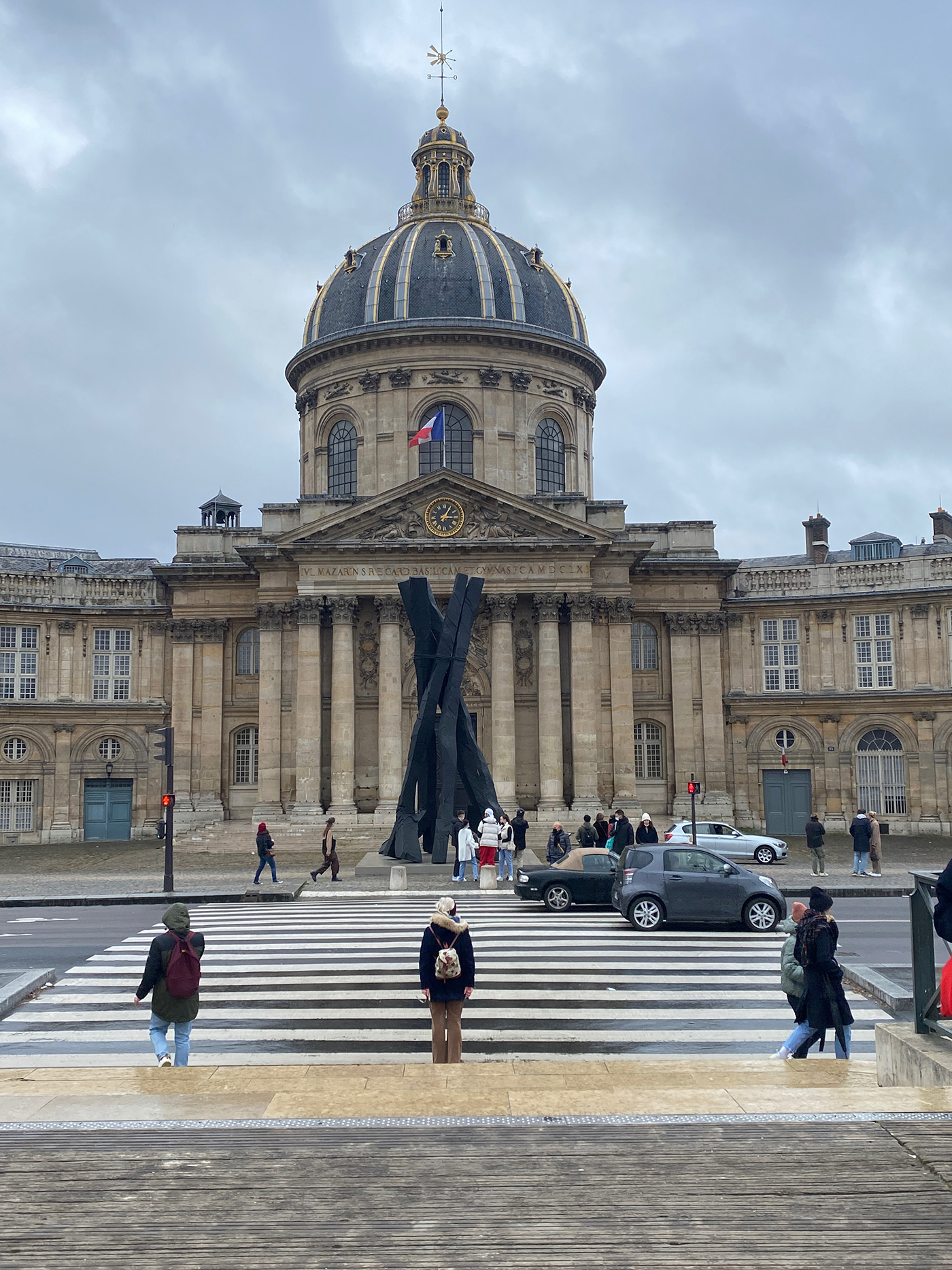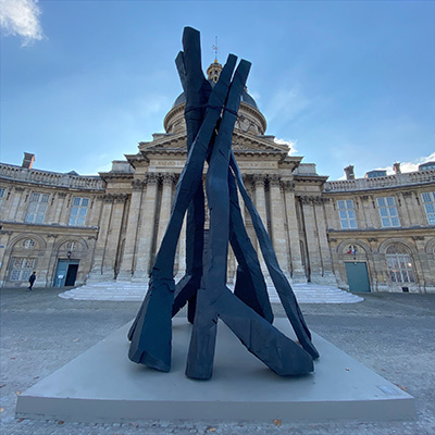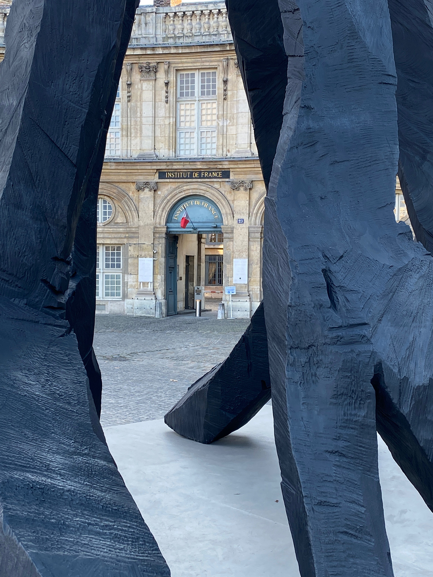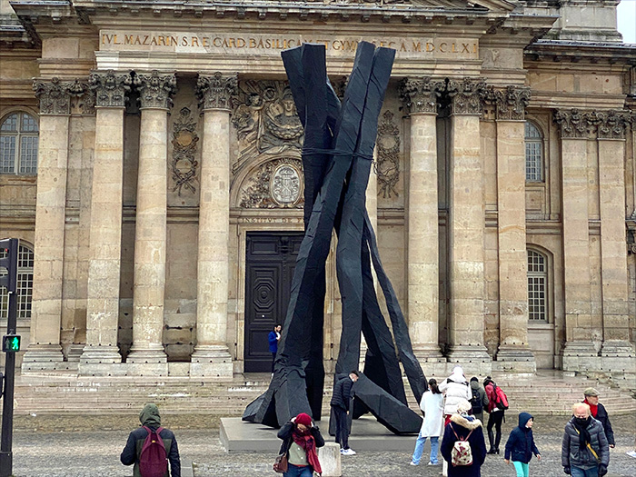 Cette statue monumentale installée [2] devant l’Institut de France, en théorie durant toute la rétrospective au Centre Pompidou (20 octobre 2021 - 7 mars 2022), a été donnée par l’artiste à l’occasion de son élection comme membre associé étranger de l’Académie des Beaux-Arts.