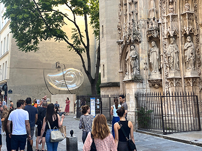 "Le mouvement végétatif" de Victorine Müller, artiste suisse vivant et travaillant à Zürich, est une œuvre que l’on ne s’attend pas à voir dans un espace public aussi fréquenté que la rue Saint-Martin. Il a fallu d’abord imaginer et fabriquer la structure qui la mettrait en valeur et la retiendrait des bourrasques de vent : la spirale très fine a été réalisé par un artiste-artisan ferronnier, Nicolas Amar, et le montage en lui-même fut une prouesse technique de Thomas Monnier, régisseur. Ensuite, le collectif 6M3- Le Socle Paris a pris le risque d’exposer cette double forme de polyuréthane (0,5mm d’épaisseur), le risque étant l’objet même de l’œuvre : montrer la fragilité, la partager et faire le pari d’une responsabilité collective des spectateurs pour la préserver.