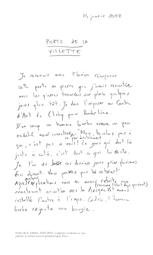 Le texte qu’il a écrit sur une rencontre avec un SDF devant une de ses portes de pierre qu’il a réalisée à la Porte de la Villette, à Paris, est un condensé de sa démarche : créer une porte apparemment fragile, et pourtant stable, dans un contexte qui est lui-même une porte géographique (un dessous de périphérique), et laisser l’œuvre vivre sa vie avec ceux qui prendront soin d’elle, ici des marginaux. L’attention esthétique qu’il développe est, chez lui, non dissociable de l’attention à l’autre.