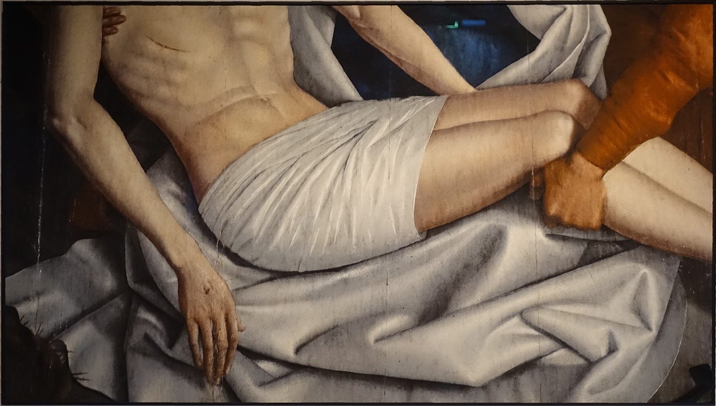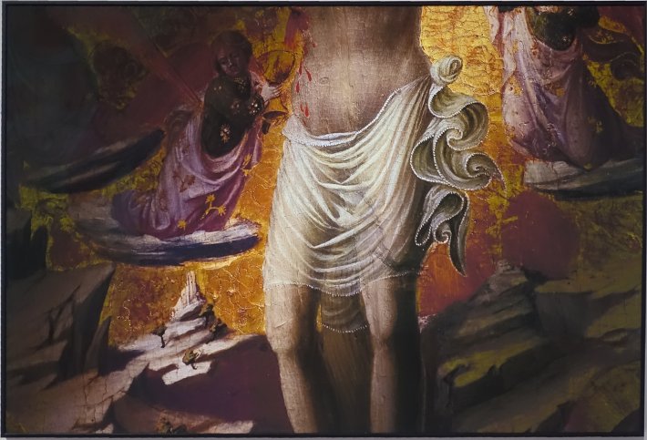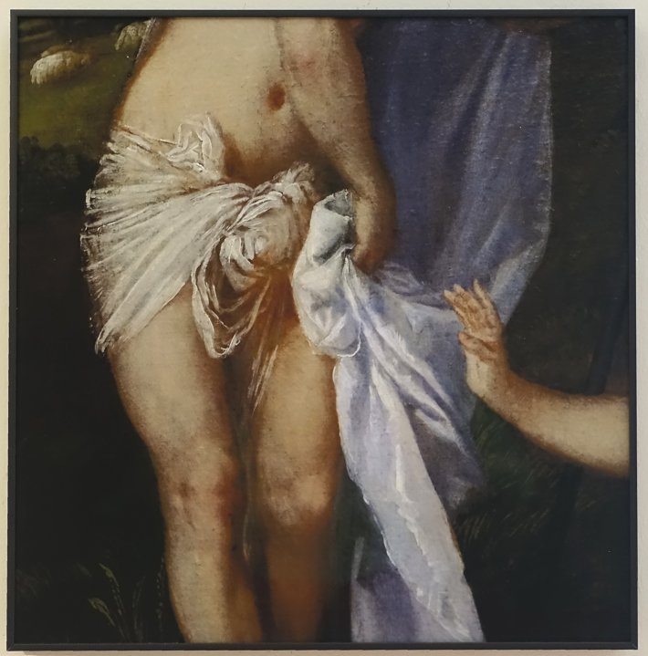 Le Titien (1488-1576) est le peintre qui a voulu se libérer de la ligne et de la forme du Moyen Âge en utilisant la couleur. Mais il a été aussi le créateur de nouveaux canons féminins, dont la Vénus d’Urbin qui a servi de modèle à l’Olympia de Manet. Et c’est lui qui a peint un « Noli me tangere », où le périzonium n’est pas associé à la Crucifixion. Jacqueline Salmon fait un cadrage étonnant, en insistant sur la caractère intime de la scène de la rencontre avec Marie-Madeleine : une main tendue en direction de l’entrejambe du Christ, qui se protège à l’aide d’un drapé bleu. Le périzonium, à moitié transparent, entoure avec délicatesse ses hanches, qui apparaissent très féminines, de même que le ventre, légèrement arrondi. Preuve s’il en est que le motif du périzonium ouvre sur bien d’autres perspectives, peut-être très contemporaines.