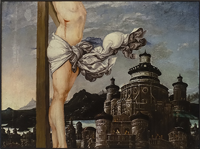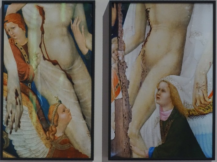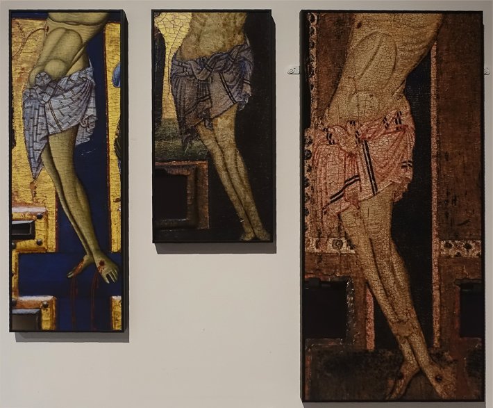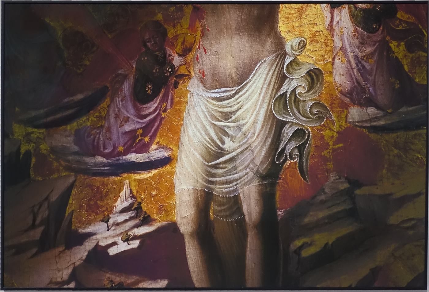 Les fonds d’or qui dominent dans les représentations du Moyen Âge et des premiers temps de la Renaissance font partie des solutions picturales qui traduisent en image l’espace indicible du monde divin. Au début du XIVe siècle, Giotto, encore lui, marque une rupture avec cette tradition : la sainte et grave majesté de l’époque précédente est oubliée au profit d’une vision plus « naturaliste » de l’homme et du monde. Les fonds d’or deviennent bleus. Si au XIIIe et au XIVe siècle, le sang ne tache pas le périzonium et jaillit loin du corps, car il est recueilli dans un calice porté par un ange, au début du XVe siècle se diffuse une autre iconographie du Christ en croix : le buste est traversé par un filet de sang reliant la poitrine à l’aine, le lien est fait entre le sang versé au moment de la circoncision de l’Enfant Jésus (incarnation bien humaine de Dieu) et le coup de lance de la mort.