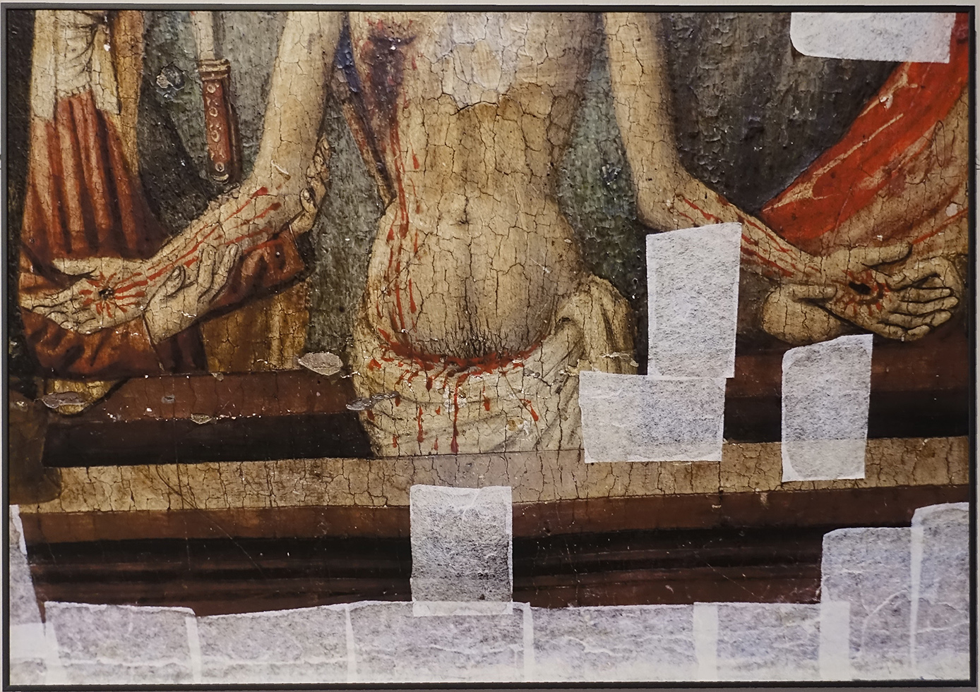 Jacqueline Salmon s’est intéressée aux réserves des musées et y a trouvé des œuvres mal connues de petits maîtres du Gothique international qui exprimaient toute une délicatesse, une finesse du pinceau, mais aussi l’attention que les conservateurs ont à l’égard des tableaux qui s’écaillent, avec leurs « facings », les patchs blancs. On y découvre les images de Christs vulnérables et résignés.