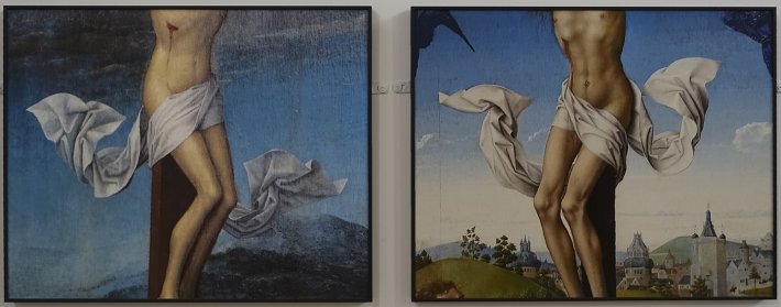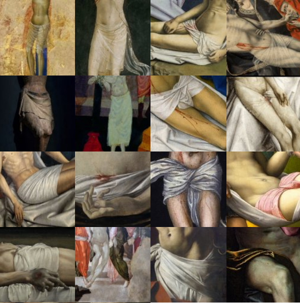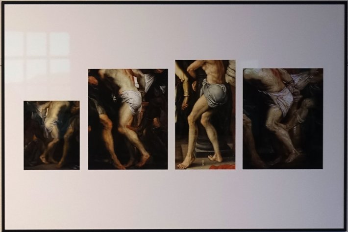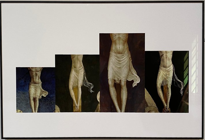 Pour l’exposition d’Arles, elle a assemblé ses planches pour exprimer des époques, des variations, des rapprochements à des siècles de distance. Sa démarche tient de l’histoire de l’art, mais va bien au-delà : elle a fait une œuvre sur les œuvres, qui provoque l’émotion, le résultat allant plus loin que le procédé. En effet, elle a utilisé la technique du cadrage, qui est bien plus que celle de l’extrait, sur le périzonium dans son entièreté, en ne présentant pas son hors-champs qui, lui, n’est autre que toute l’œuvre du peintre ou du sculpteur. En travaillant sur des reproductions, sur des tableaux ou des sculptures sans apport de lumière supplémentaire (ce qui fait partie de l’art du photographe), elle s’est concentrée sur la question de la représentation de ce morceau de tissu par les artistes, en ramenant dans son « filet » bien d’autres choses comme le vieillissement des supports, les fragments de paysages, des fonds et des ciels, des personnages, des mains, d’autres aspects, comme le sang coulant du côté (dessus ou dessous le tissu), etc. Le périzonium ainsi cadré agit comme une loupe adaptée à l’histoire de l’art qui permet à la photographe contemporaine d’interpréter à son tour les moments du supplice, mais aussi l’approche et la sensibilité de toute une époque en faisant des liens entre des époques distantes.