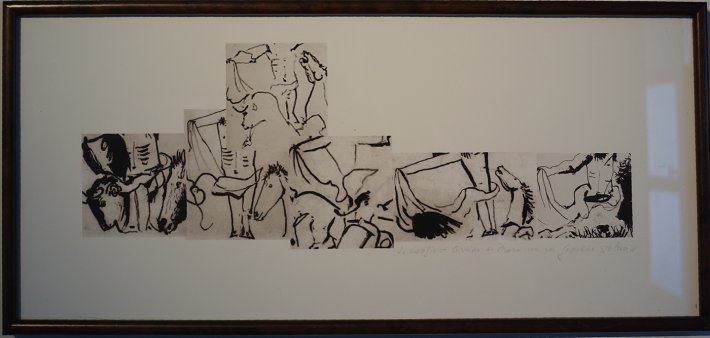 Picasso marque dans certains de ses dessins un intérêt pour la Passion du Christ et l’associe à son thème fétiche de la corrida. Les deux ont les traits d’un spectacle pour les foules et s’achèvent sur une mise à mort. Le Christ, cloué sur la croix, est muni d’une cape qui se mêle à son périzonium et dirige le taureau.