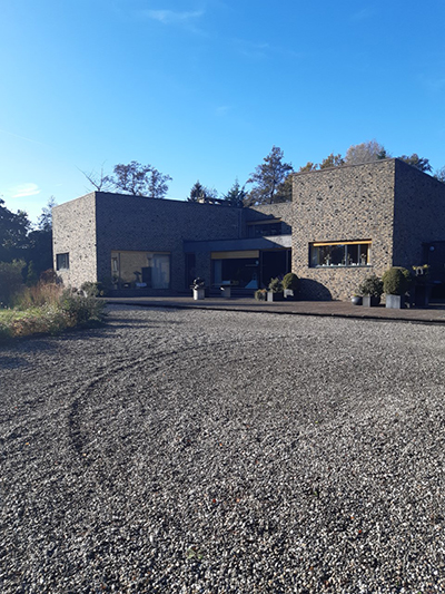 Approchons donc de cette maison. Avec ses murs de brique aux textures des tableaux de Permeke et sa géométrie orthogonale rythmée par de grandes baies vitrées, elle est d’une beauté farouche et sereine, conçue semble-t-il de manière centrifuge, du dedans vers le dehors. Autour, au-delà des terrasses, la terre est couverte de graviers jusqu’à l’étendue herbue dans laquelle se sont enracinées de grandes tranches d’arbres comme autant de disques énigmatiques. Approchons. Approchons des bronzes disposés comme des acteurs sur le sol de pavés sombres. Du bronze encore, mais en faible relief, couvre sur plusieurs mètres le mur de l’entrée. Entrons.