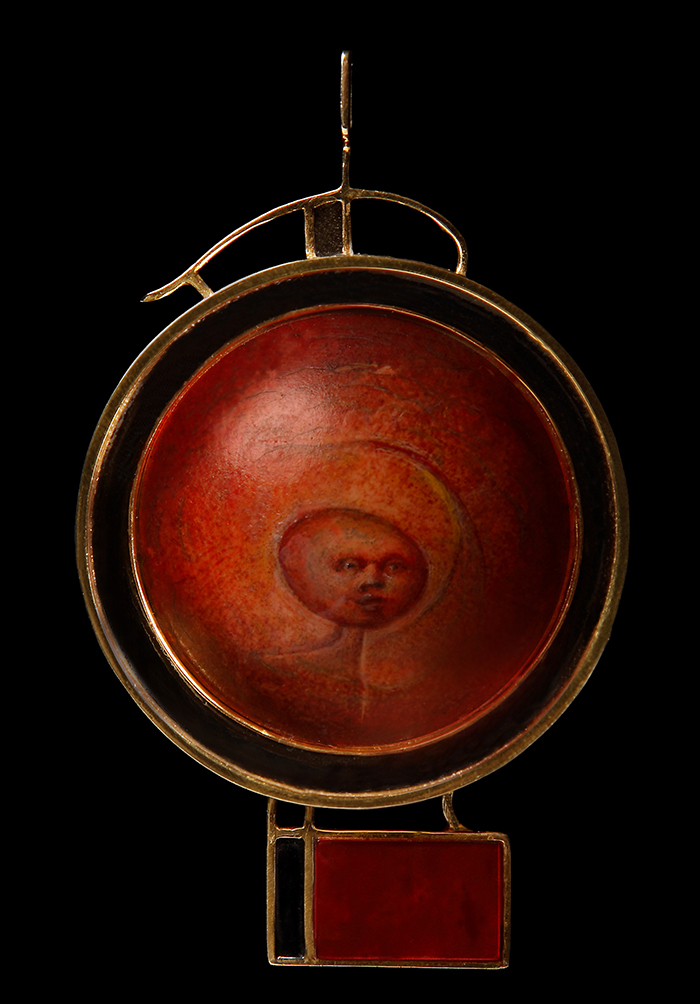 C’est donc dans cet atelier, Mona n‘est jamais loin, qu’il travaille en solitaire. Mais, pour les grandes pièces en céramique ou pour les sculptures monumentales en bronze qu’il crée à partir de ses 70 ans, il abandonne cette solitude pour rejoindre, dans des structures plus vastes et plus outillées, le plaisir du faire « en équipe ». Cependant, dans la maison, un autre atelier, accroché en mezzanine du premier, révèle une autre face de l’univers Landuyt. Il ne s’agit plus de manier le pastel, l’huile ou la terre, mais de convoquer l’exceptionnel, l’or, les pierres précieuses et semi-précieuses ainsi que d’autres fragments du monde naturel : les perles, l’ivoire, l’os, les coquillages, les fossiles mêlés ainsi au jade, à l’émeraude, au saphir, à l’agathe, au rubis. Il en fait des colliers, des bracelets, des boucles d’oreille qui ont davantage l’apparence des parures égyptiennes ou aztèques que le seul éclat qui se vend du côté de la Place Vendôme. Parfois, au pinceau fin, il peint au cœur de sa composition, sur un disque d’ivoire, un visage, rouge le plus souvent.
