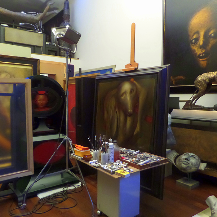 L’endroit, inondé par la lumière qui traverse une immense vitre, est d’une surprenante propreté. L’espace pourtant est habité par des oeuvres anciennes et d’autres, en chantier. Il y là les chevalets, l’un ou l’autre projecteur, des toiles entassées les unes derrière les autres ou déposées sur le sol. Aux murs, d’immenses peintures lourdement encadrées. Et, dans les interstices de cet espace, parfois sur une table basse ou une tournette, des sculptures achevées ou non, des bombes, des tubes de couleurs, pastels et pots divers. Entre encore, ses modèles du moment : une amphore méso-américaine, un tapis ancien et, à même le sol, un oiseau momifié. Plus tard, ils rejoindront le salon, les couloirs et, surtout, le sous-sol où sont rangés avec soin, bien d’autres curiosités naturelles et artefacts venus d‘Asie, d’Afrique ou encore du monde méso-américain. Il s’agit donc, en acquérant ces objets, moins d’une passion de collectionneur que d’une recherche qui alimente une investigation de la réalité. Cela peut être un cabinet à miroirs, un masque africain recouvert de sang coagulé, une momie, une tourelle, une pierre ou un foetus dans un bocal.