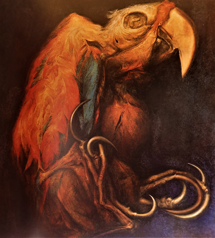 C’est aussi le moment où ses modèles changent. Grâce à l’intervention d’Henri Langlois avec lequel il est entré en contact lors de séjours à Paris, il acquiert une véritable momie péruvienne et revient à la macro pour peindre des visages et des animaux. Parmi eux un perroquet inspiré par une autre momie dont le rendu des textures s’adapte à un processus créatif nourri de l‘expérience des surfaces essentielles autant que par la topologie de René Thom et les systèmes instables de Prigogine. Depuis, l’œuvre se développe, mêlant parfois aux peintures ou aux sculptures des fragments venus d’ailleurs, mais toujours creusant toujours davantage les savoir-faire du monde, les hypothèses scientifiques et les pouvoirs de la poésie.