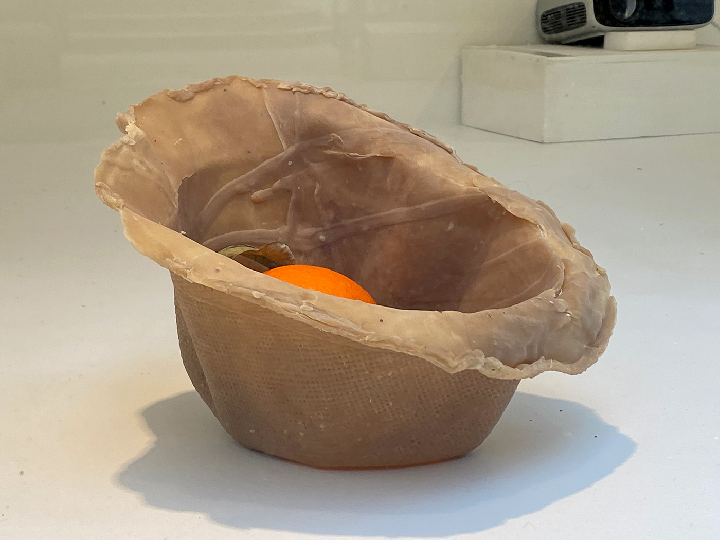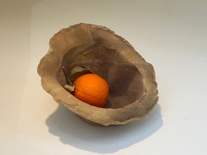 Quel est le véritable objet de cette belle et déroutante exposition faite d’un chapeau, d’une orange, d’un écran de cire et d’une vidéo qui interroge le regard ? Une manière de solliciter les sens en plein hiver par des évocations du soleil, au moment où il se fait rare. Pour cela Emma Bourgin poursuit sa recherche sur les formes matérielles, et notamment la cire découverte durant ses études aux Beaux Arts, tout en empruntant quelques chemins philosophiques qu’elle aime à parcourir.