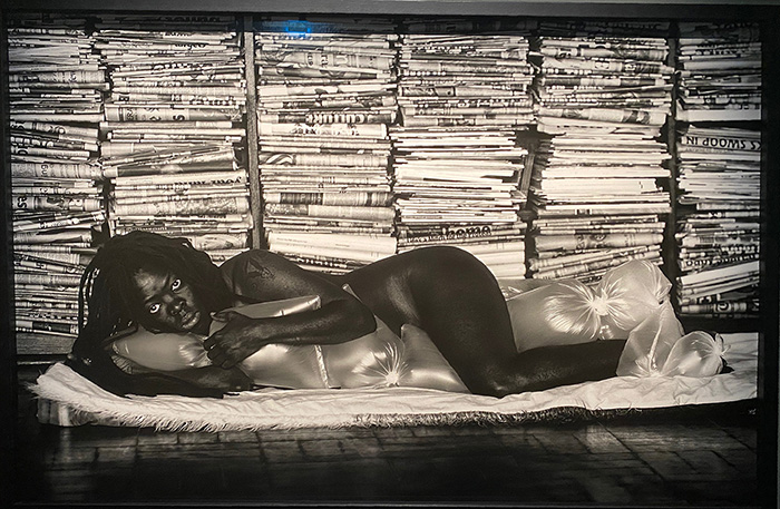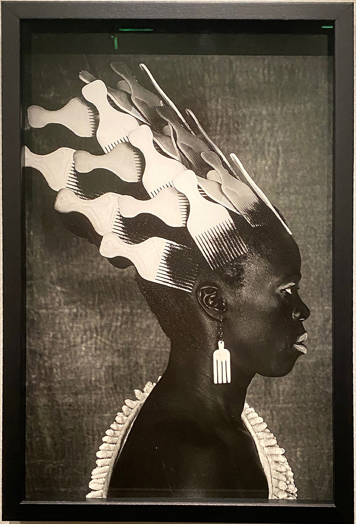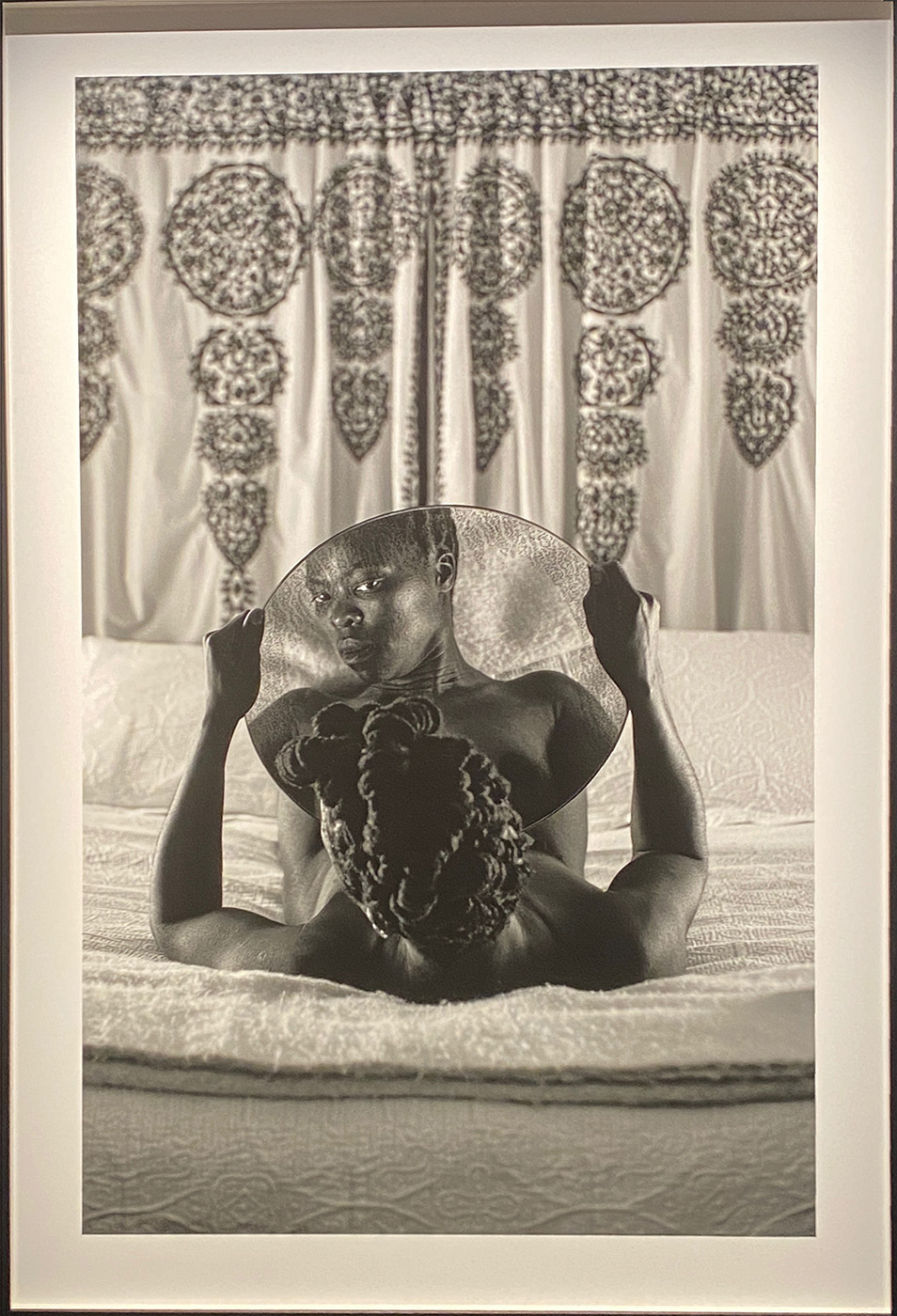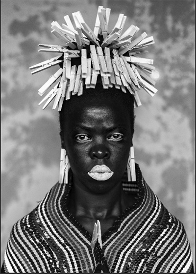 « Somnyama Ngonyama », 2012-encours. Dans ses magnifiques autoportraits, où elle accentue le noir de sa peau et peut maquiller ses lèvres et yeux de blanc dans un jeu dense de contrastes, elle incarne différents archétypes et explore des représentations des femmes noires dans le monde. Ces photos ont été prises dans des hôtels en y plaçant des objets pour rendre compte de l’environnement. Quelques portraits représentent le personnage de Bester, du nom de sa mère qui a travaillé comme employé de maison pour une famille blanche durant quarante ans, subvenant seule aux besoins de ses huit enfants. On la voit avec des éponges métalliques, des peignes, un tabouret sur la tête, autant d’objets du quotidien de cette femme.
