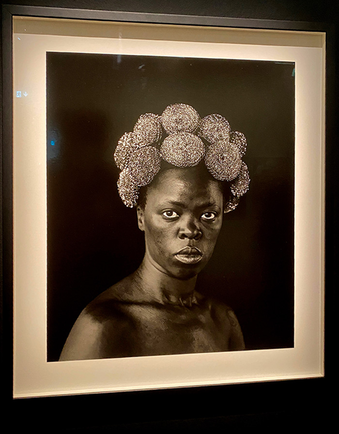 Ses autoportraits en noir et blanc, intitulés « Somnyama Ngonyama » (« Salut à toi, lionne noire », en zoulou) et réalisés aux quatre coins du monde, fascinent. Son regard intense fixe le spectateur, la sobriété et l’élégance sidèrent. Ils sont à un point d’équilibre où la beauté explicite et le mystère vous arrêtent, avant que le détail fasse irruption et vous connecte avec la finalité des clichés. Que les cheveux portent un diadème, des pinces à linge, des tuyaux d’aspirateur, des rouleaux de scotch ou des colliers ne choque pas. La dignité est mise en scène. Et c’est dans le même esprit qu’elle documente la vie de la communauté noire LGBTQIA+, de son pays l’Afrique du Sud et de tous ceux qui sont la cible de violences et de préjugés.