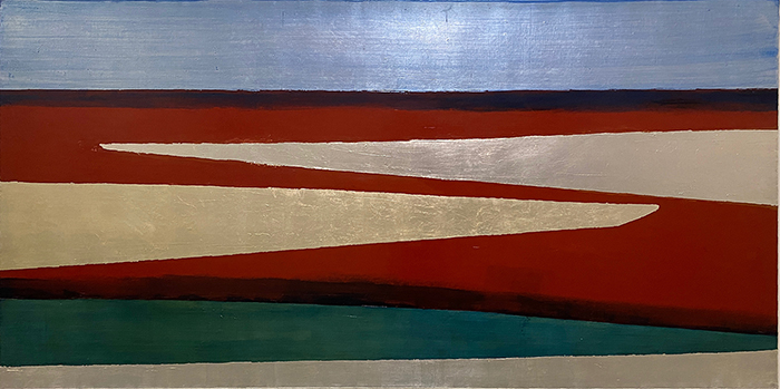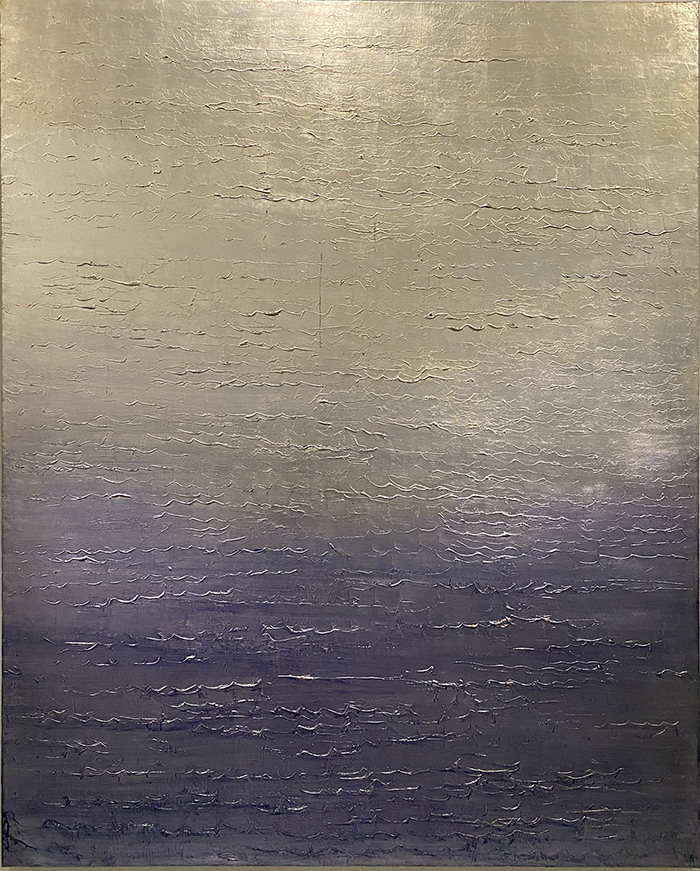 C’est en observant son environnement, la mer et les îles, notamment les pierres qu’elle dessine, que naît son art hors des chemins habituels, incluant des matériaux en feuilles de métal qui seront sa signature. Un art nourri d’une forte introspection.