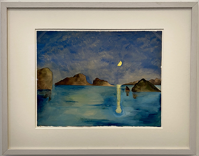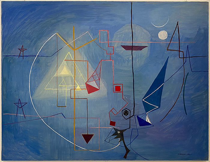 Mais c’est dans les années 50’ qu’elle va construire une œuvre singulière, difficile à situer, à partir d’un alphabet visuel comprenant pierre, lune, planète, arbre, montagne, vallée, barque.