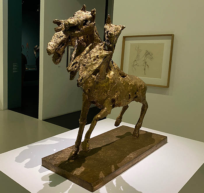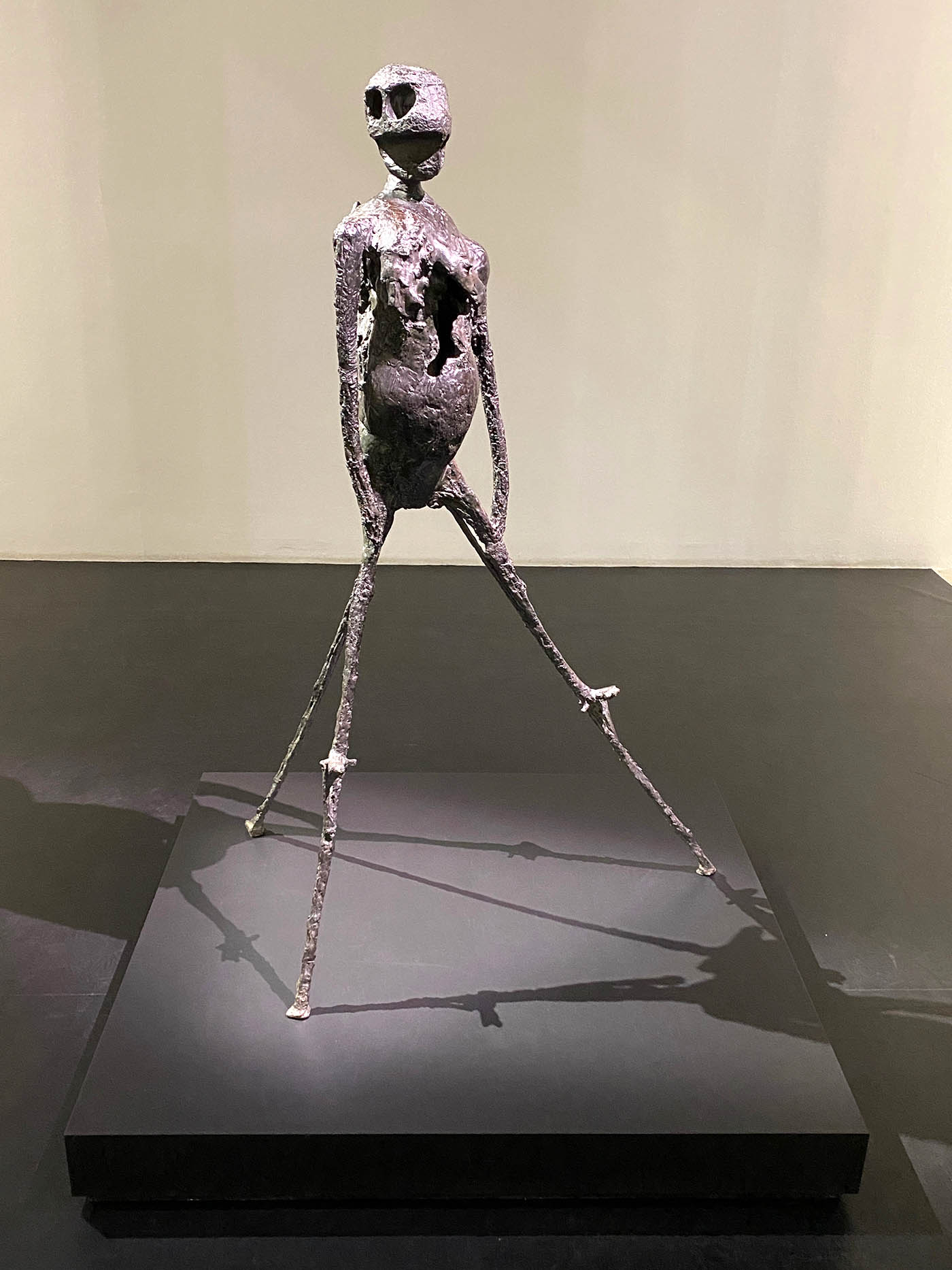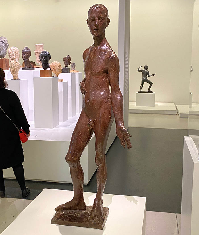 Entre « Loretto » (1934) qui s’inscrit dans le sillage de Maillol, lisse, épuré, sage, mais opérant déjà un pivotement des jambes et son « Homme qui marche » (1945), la distance est grande.