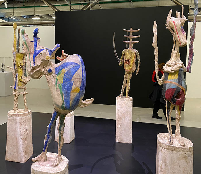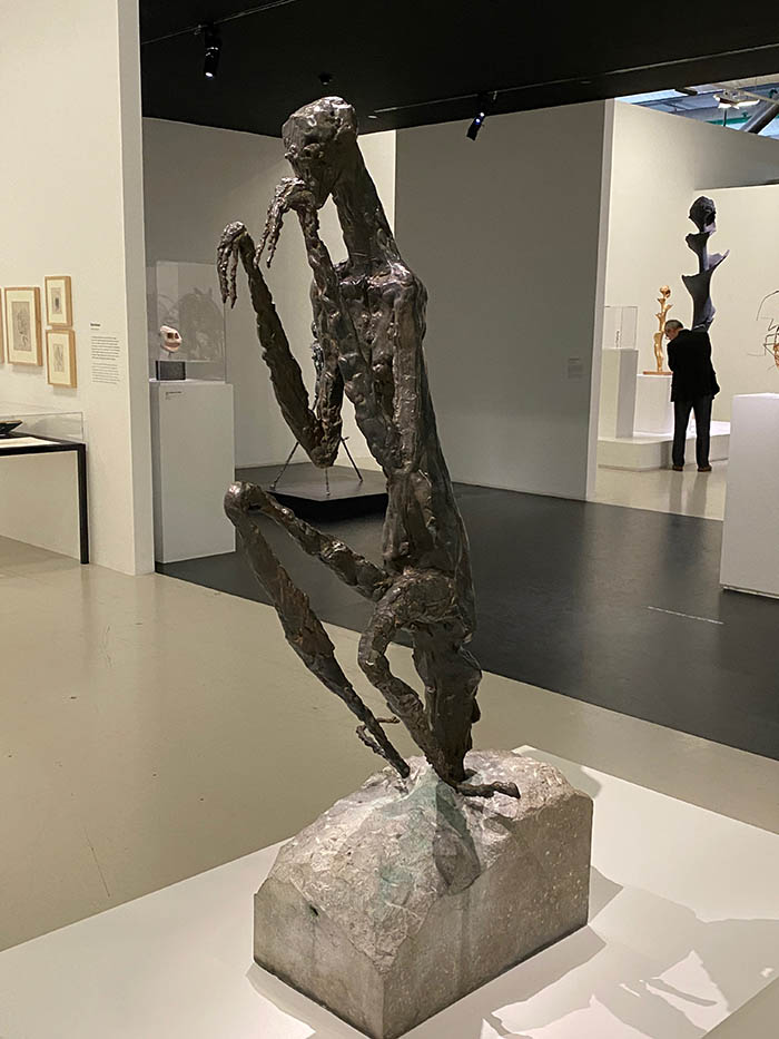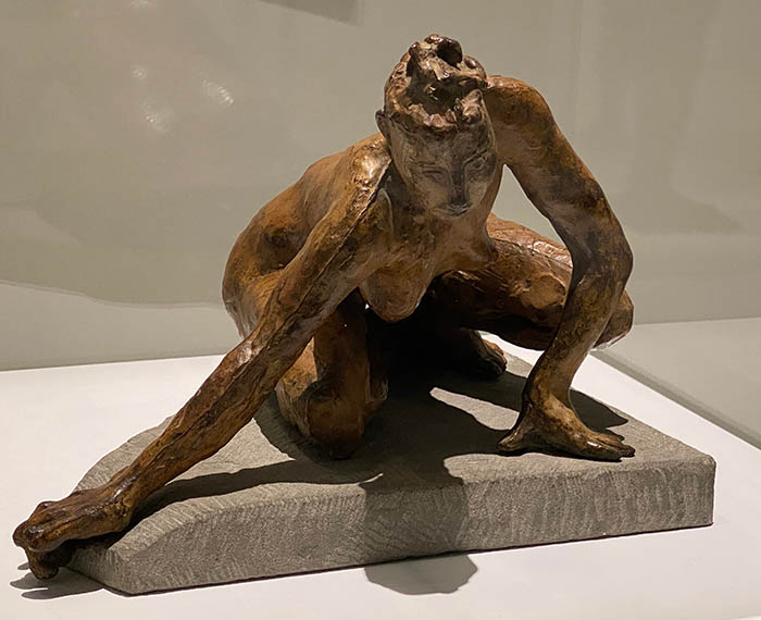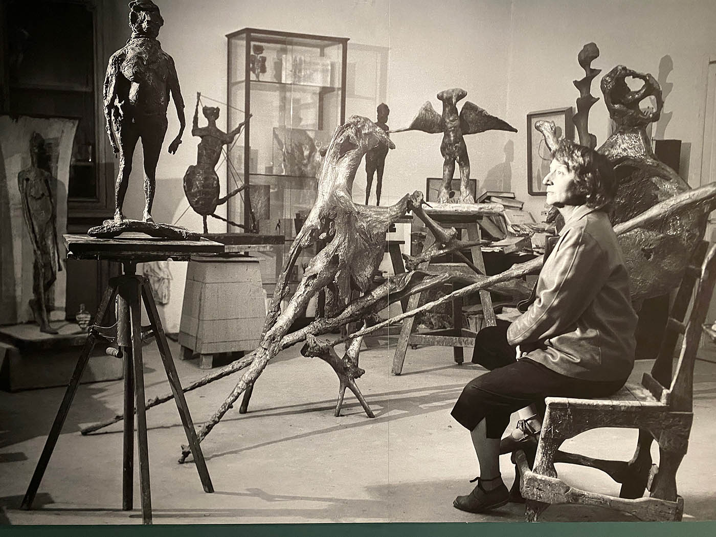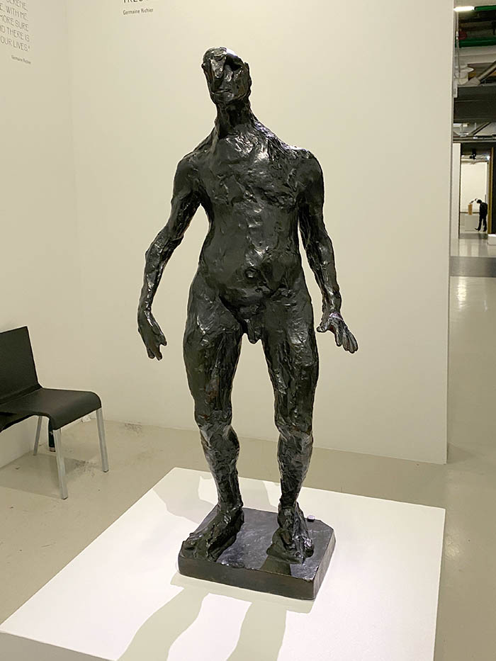 Elle fait alors référence à l’œuvre iconique de Rodin, dépourvue de tête et de bras ; mais elle lui donne de la lourdeur, de l’empattement, le rend presque immobile. La tête est inachevée, avec un trou à la place de l’œil. Une autre vision de l’homme de l’immédiat après guerre. Elle suit son propre chemin et contribue à la modernité. Son œuvre est très différente de celle de Giacometti, qui a été pourtant élève de l’atelier Bourdelle. Finalement celui-ci l’évince à la Galerie Maeght, avant d’être second à son tour dans les grandes expositions publiques (Orangerie 1969).