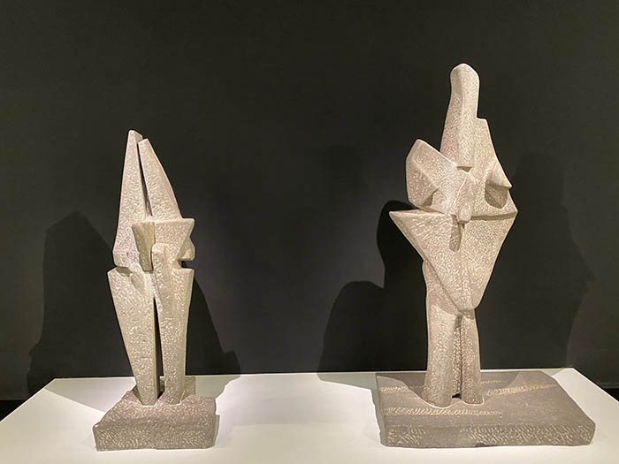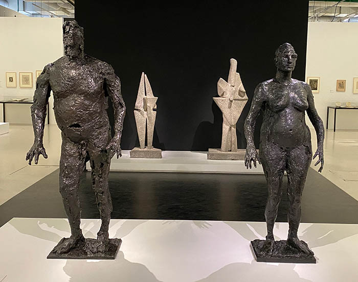 Le « couple » de sculpture, l’Orage (1947-1948) et l’Ouragane (1948-1949), est un moment fort de la rétrospective, d’autant qu’il est mis en scène avec son double abstrait sculpté en pierre avec l’aide d’Eugène Dodeigne, les « Tombeaux ». L’artiste pense le devenir de l’humain. « Plus je vais, plus je suis certaine que seul l’humain compte. » (Lettre à son premier mari, années 50)