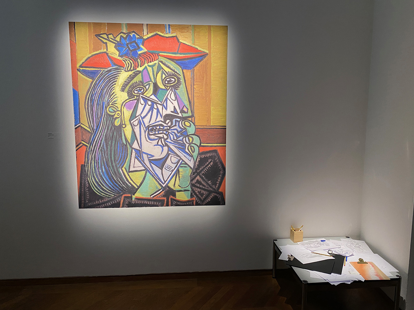 Le spectateur est invité à la regarder dessiner La Femme qui pleure de Picasso à l’aide d’un crayon qui grince et produit une étrange mélodie.