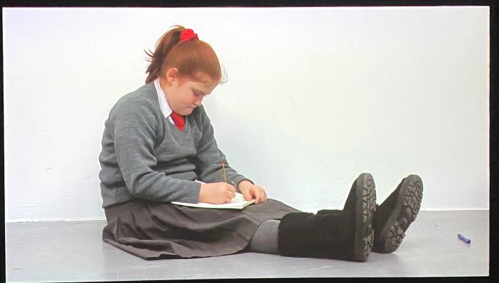 Ruth, une jeune fille en uniforme scolaire, est installée à même le sol, dos contre le mur de la TATE Liverpool.