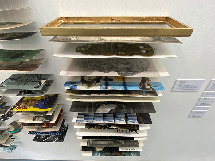Cheminées (2022). Si l’on n’ose pas un tel détachement avec notre propre réalité, Sandrine Saïah renverse les cadres et le champ visuel frontal traditionnel de notre espace physique avec la structure Cheminées pour redonner du souffle, du rythme, en déployant une succession verticale d’images.