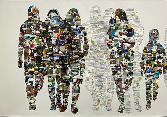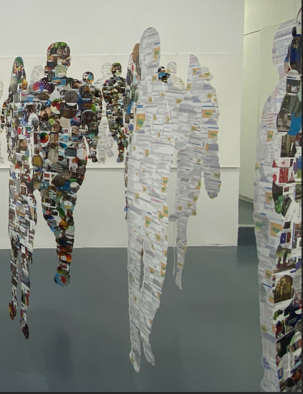 Avec son installation Portant (2017), l’artiste-anthropologue convoque alors des silhouettes d’anonymes en taille réelle, bien qu’individualisées par le contour de leur corps imprimé sur vinyle, pour former un ensemble de singularités dont les dénominateurs communs du numérique constituent des flux de données et d’informations qui les connectent. Les innombrables images fragmentaires qui ont laissé leur empreinte – indélébile ? – sur ces profils colonisés donnent à voir une réalité vertigineuse où le déplacement se fait sur une ligne du temps en constante progression.